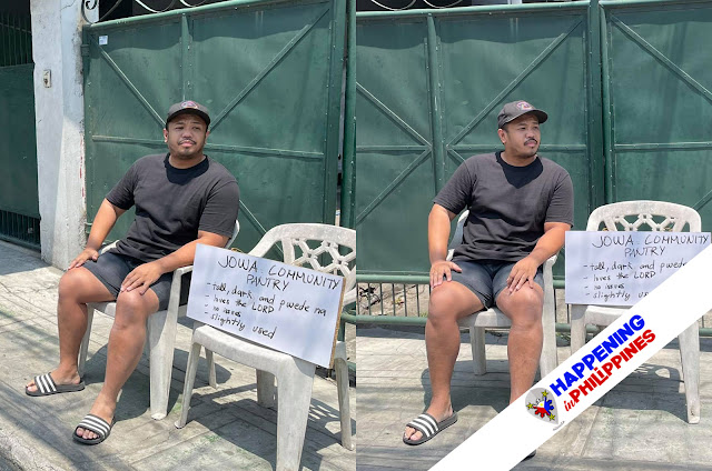 Nakalagay sa kanyang karatula ang “Jowa Community Pantry” habang nakaupo siya katabi ang kanyang itinayong pantry.