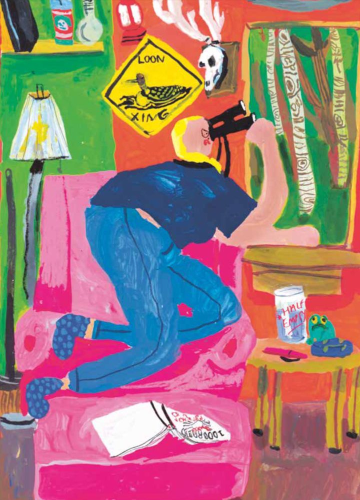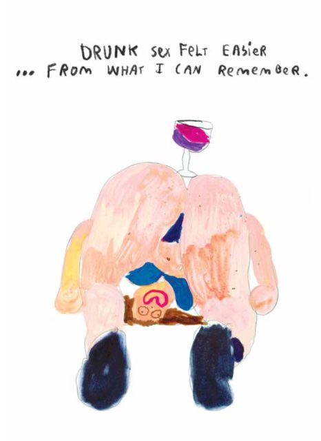 In one comic about how alcohol became destructively tied to her sex life, she says “Sex is weird. Sobriety & sex can be difficult for a lot of reasons—Especially from a trauma perspective. Drunk sex felt easier…From what I can remember.” The text is quietly heavy and thoughtful, its ellipsis laden with the terrified lacunae of someone who’s had far too many black outs. But the painting beneath the caption is playful. In it, Booth stares at the reader through her spread legs in a naked downward dog position, a glass of wine precariously perched between her butt cheeks. In a comic about binge eating, an anthropomorphic piece of cereal in cowboy books and a hat whispers at Booth to “Finish me,” before she pours bowl after bowl of cereal into her mouth. They’re cartoony and weird with an underlying unease and sadness. Memoir relies on creating a compelling relationship between the feeling of an experience in the moment with all of the insight and anxiety of writing about it. Knowing this, Booth takes advantage of comics’ unique ability to present both states at the same time resulting in a vital, dynamic memoir.