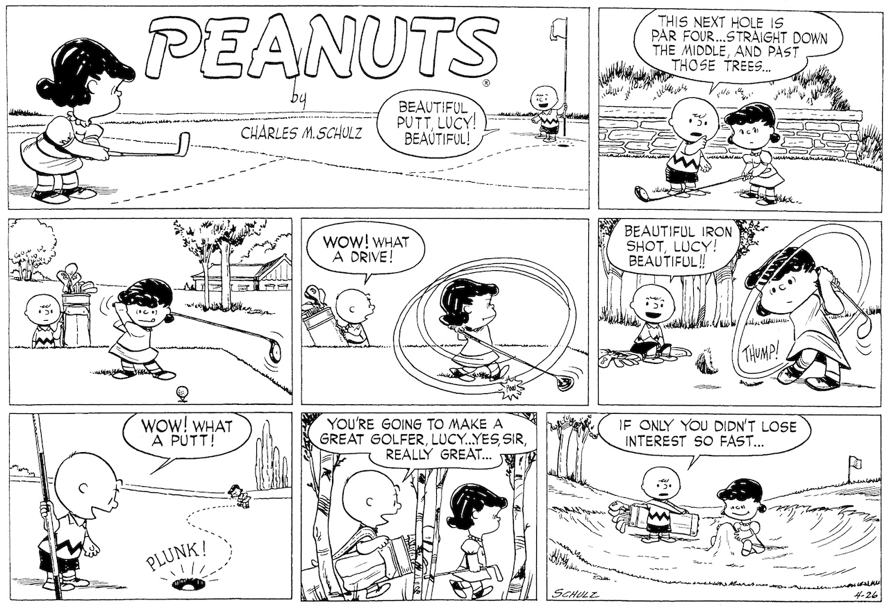 SHULZ: I would like to, but it's too late. I've locked myself into this drawing style, and I can't escape from it. And I think for me to draw the way Hank Ketcham used to draw just wouldn't work. Hank was drawing panels from wonderful, different camera angles, reflections in mirrors and things like that. Which simply would never work in my strip. For one thing, it would make everything too realistic. And Dennis the Menace is pretty realistic. He even said to me once on the golf course — we were playing in the AT&T together. We didn't get a chance to talk very much, but one day we were talking about the features, and he said, "Your strip is really more of a fantasy, isn't it?" And I said, "Yeah, I guess maybe it is." [laughs] I didn't know he had even thought about it.