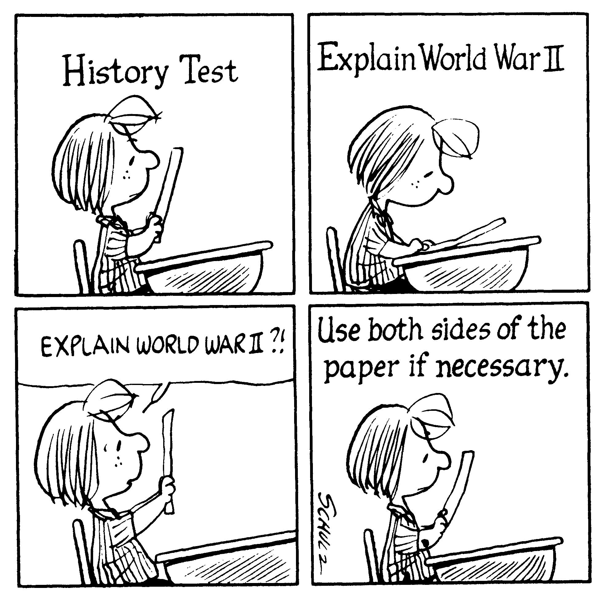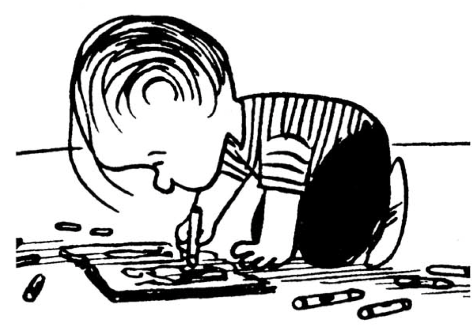 SCHULZ: I think it was the teachers' fault. I think... music teachers were the worst of all. Music teachers were the meanest. Art teachers were always pretty nice. But they weren't capable of either doing cartooning themselves or even appreciating it. And they had to bring the whole class down to the lowest denominator. Because these weren't kids that, especially, were going to be artists, or even interested in it, but they had to create projects that would interest the whole class. So you ended up having to make posters or doing watercolors of flowers or silly things like that, which just drove me out of my mind. [laughs] You never got to do any drawing; it was always some kind of project. Even linoleum cutting- which I never got into. I was glad I never had to do that. But as far as drawing goes, we rarely got to do any real drawing. It just had to have been the teacher's fault.