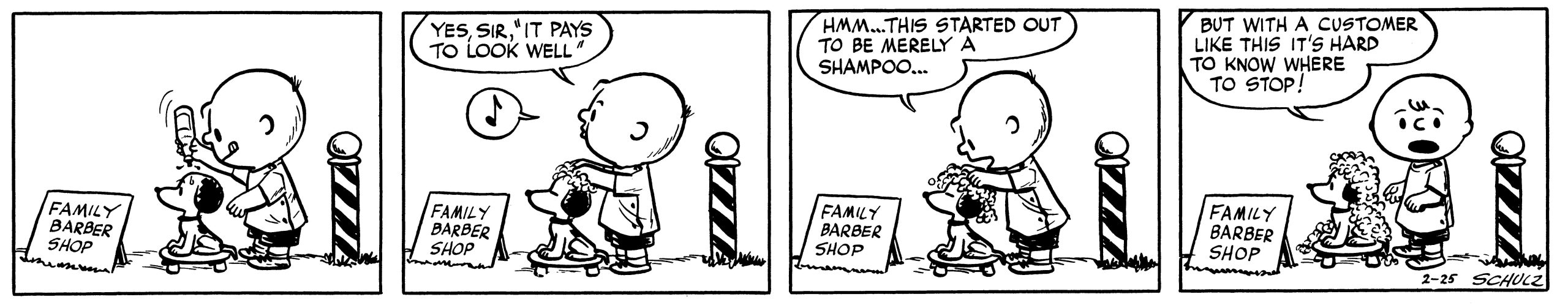 "My dad was a barber," Schulz recalled. "I always admired him for the fact that he and my mother had only a third-grade education, and from what I remembered hearing in conversations, he worked pitching hay in Nebraska one summer to earn enough money to go to barber school, got himself a couple of jobs, and eventually bought his own barber shop. And I think he at one time owned two barber shops and a filling station, but that was either when I was not born or very small, so I don't know much about that." Except for a misguided year-and-a-half interlude spent in Needles, California ("an eerie and eternal summer" Schulz called it), he grew up in St. Paul. "We settled in a neighborhood about two blocks from my dad's barbershop, and most of my playtime life revolved around the yard of the grade school across the street from our apartment."
