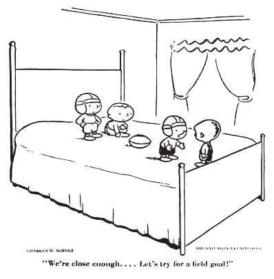 SCHULZ: Oh yeah. Visuals are extremely important. I think a lot of cartoonists these days have gotten away from that. It's the basis of what cartooning is. I've been quoted on this many times, that cartooning is still drawing funny pictures. If you don't draw funny pictures, then you might as well be writing for live television or some other form of entertainment. But visuals were extremely difficult. I think you can run out to the end very quickly. That's what worries me lately, as I turn 75 in a couple of months, that I might have done so many things with so many situations. How many funny pictures can you get out of Snoopy looking up and watching the leaf fall out of the tree? And yesterday I think I spent almost the whole afternoon trying to get something funny out of Linus sitting in a cardboard box trying to just slide down the hill. I really like drawing, and I came up with one idea, but I still can't decide if it's funny enough or not. So l abandoned it. I finally went into a totally different direction. But there's so many things that I really liked having done, I would like to just keep playing on these themes and variations as much as I can. But sometimes I feel like I've run right out to the end, and there are no more ideas anymore. I'm always amazed when I haven't done something for maybe ten years on something like that, and one day I think of one. And then I wonder, "Why in the world didn't I think of that ten years ago?" Why did it take me ten years? This is playing on the same theme, but this is the way it is. And I think this is one of the things you learn about after doing it for so long.