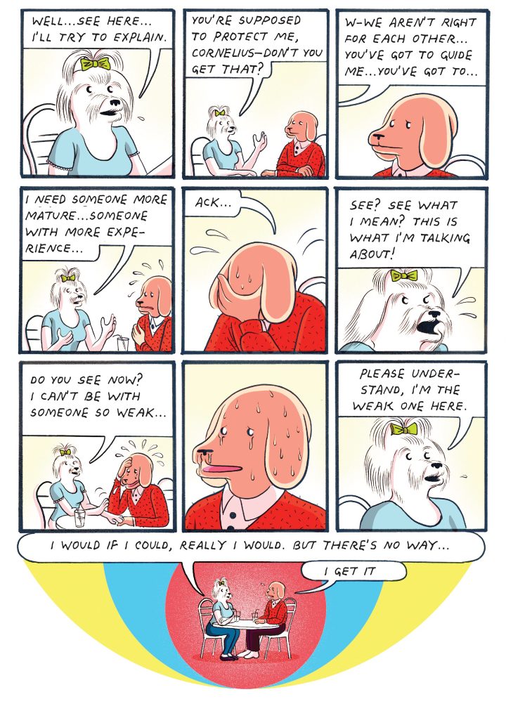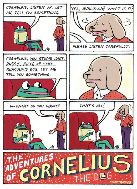 The unsettling and unresolved elements of Cornelius may well be the point. The absurd is there to make us aware of the delicacy of our reality, and laugh at our efforts to make things make sense. Even with all the rationality in the world, people often do inexplicable things. In this instance, Torices’s mission as a cartoonist seems to have been to produce a book where the reader can get lost within the inexplicable, with a fine wretched dog as a mirror to our own absurdity and failure to act.
