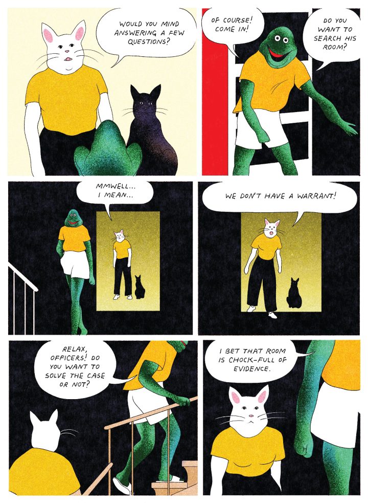 Torices has been drawing Cornelius for over a decade at this point, and the character has often appeared in self- or indie published zines. Here that origin, as well as Torices’s interest in vintage comics, is apparent in the various title pages, each with unique calligraphic treatments, that make an appearance throughout the book. A meta commentary is also included, in the introduction and end notes, where a fictional editor introduces Cornelius as if he’s a millennia old icon, one who has been a major figure in the comics industry of a fictional country of Maiame. The meta jokes found within the end notes didn’t quite land with me; they feel like absurdity for the sake of it, though the joke is on me, as the fictitious editor is quoted as saying: “If you’re so smart, why are you reading comics?”