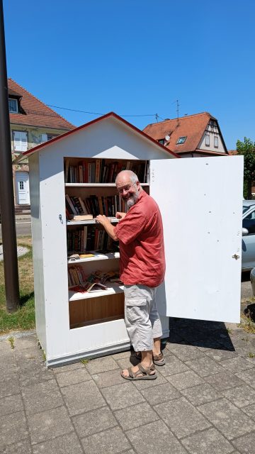 We stop by the local “book box” on the way back to the office — a painted wooden closet on a street corner where local people leave unwanted books for neighbors and strangers to take. JC rummages like a man who can smell a rarity through hardwood, emerging triumphantly with three finds. “After I’m dead, my kids might get three euros each for these,” he grins.