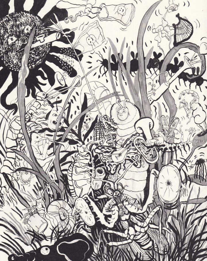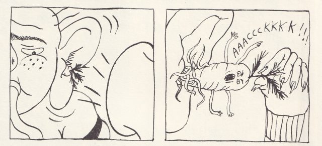 O’Connell’s drawing has a lot of music to it, with the improvisational energy of early aughts Laura Owens paintings. More than one strip includes a saxophone with a surprise inside (Snakes! Spiders!) and another includes an “ear horn” that pulls a carrot shaped parasite out of, well, an ear. The lines of her drawing move accordingly, skronking with the horns. They are jerky and expressive and every action has one more motion line than it needs, but who’s counting. Her characters dance with the confidence of children in a room full of fawning adults, their bodies grow tails and twist into impossible positions and their arms all seem to include an extra muscle, no doubt because her lines are doing visual aerobics. O’Connell’s Shriekers could sit alongside Amanda Vähämäki or Jesse Jacobs. Less subtle than Pixie Lice and less cynical than New Pets, Shriekers shares with these titles the confusion of childhood and the fantastic ways children contort reality. While Vähämäkii gives her fairy characters “Little Hexes” and Jacobs gives his characters horrific modular dogs(?), O’Connell’s Shriekers conjure up a friendly “lurking presence” and cultivate rashes with pride.