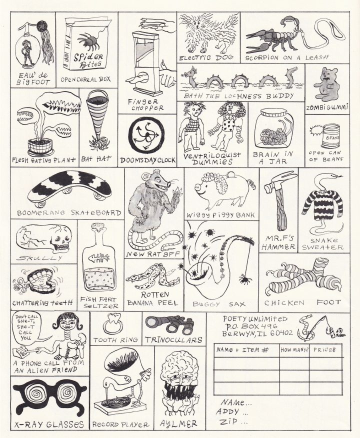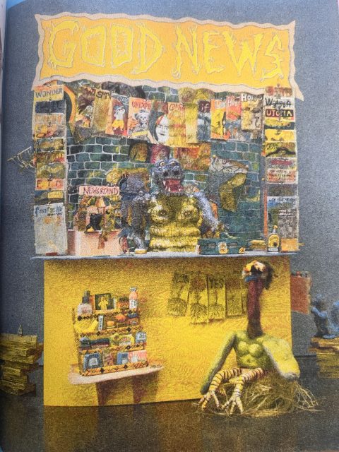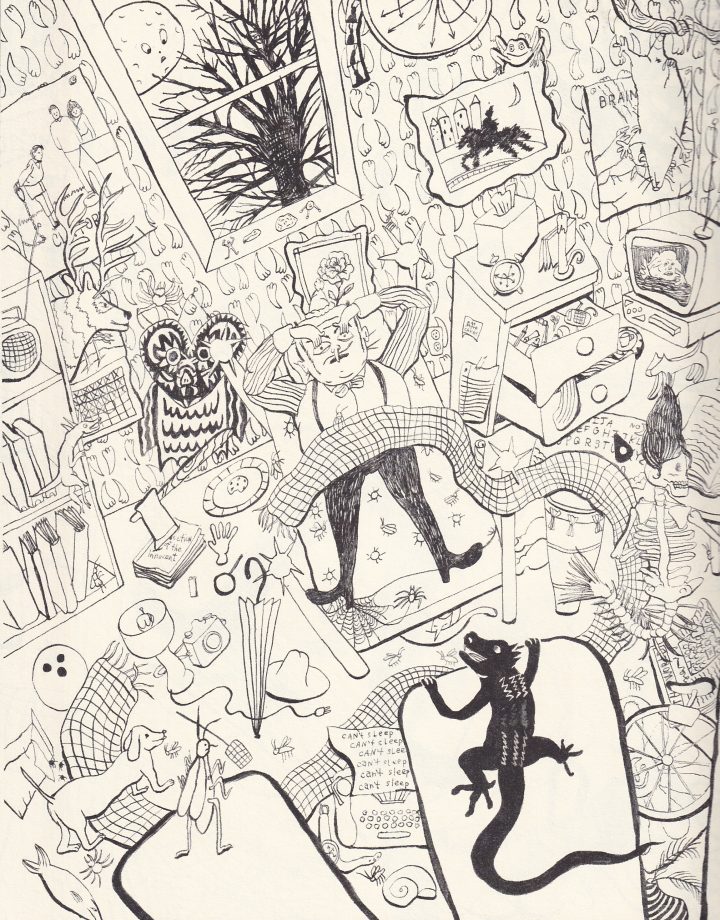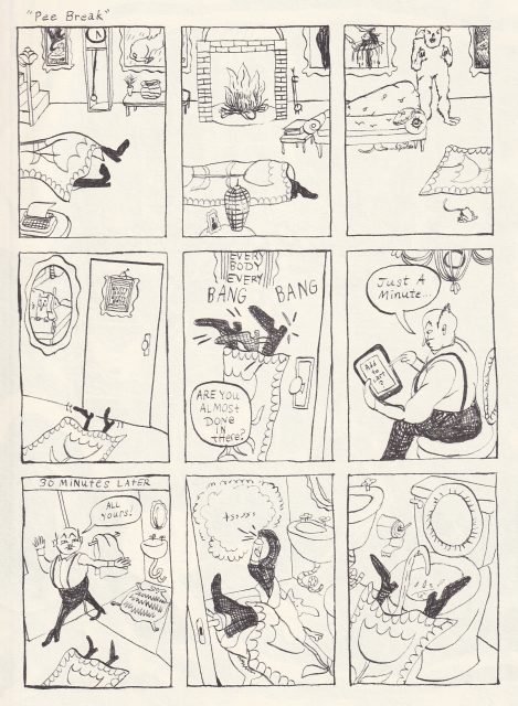 If you already know O’Connell’s work you may see some familiar faces. Alligators, swamp birds, spiders, skeletons, and clowns appear in all her books. In Shriekers they sing karaoke and spy on their neighbors. In Pebbles they straddle super highways and attack audience members. In Who’s Afraid of a Florida Woman they decorate the margins of her poetry (often about clowns) and send sexts. (It’s worth noting that Who’s Afraid of a Florida Woman, O’Connell’s poetry/prose/art book published by Colorama, deserves its own 1000–2000 word review, but if I wrote it they would all be “wow”.) As the title suggests, O’Connell is from Florida, which of course explains the alligators, and perhaps the clowns as well. Florida Woman also includes images from a sculptural installation of a newsstand created by O’Connell; PeeWee’s Playhouse meets Fischli and Weiss, a trompe l’oeil for the world of Shriekers. Seeing these images adds another dimension, literally, to O’Connell’s body of work. I am a real sucker for a multimedia artist, even when they’re clearly more adept at one form than another (Macaulay Culkin novels, Adrien Brody paintings), but it is incredibly satisfying when someone is actually good at all the media. O’Connell’s comics, poetry, sculpture, and T-shirts, are all so perfectly intertwined I would be seething with jealousy if I wasn’t having such a good time!