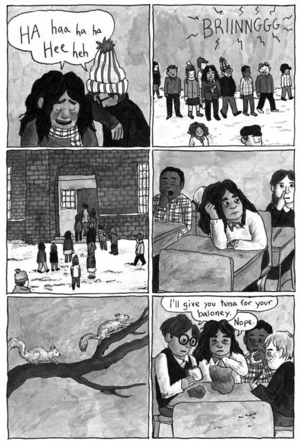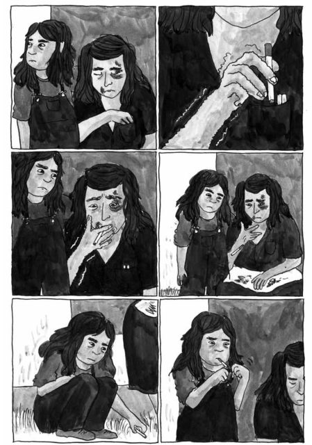 All this marks a seismic shift from Mendes’ previous books, Freddy Stories (self-published, 2011) and Lou (Alternative Comics, 2016). These early works were much gentler studies of childhood and all its complexities, deftly balancing humor and poignancy with an undercurrent of melancholy that imbued them with real emotional depth. However, while the kids in these books always had one foot in the grown-up world, often privy to things just outside their grasp (depression, divorce, violence), there was never much doubt that things would resolve themselves for the best in the end. They would, in other words, remain children. But that just isn’t where Mendes wants to go here. Like it or not, Edie will be dragged kicking and screaming into adulthood well before her time, and not even the anger and resentment she bears her father will stop her falling into the same trap as Marian, with tragic consequences.