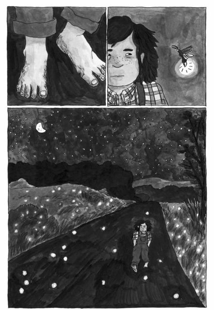 In many ways, The Weight is the polar opposite of something like Kayla E.’s recently published (and highly acclaimed) Precious Rubbish. Both deal with abuse, albeit of different kinds, but where Kayla’s book was allusive, tightly drawn, and formally complex, Mendes’ work is direct, loosely rendered, and deliberately straightforward in design and construction. A basic six-panel grid predominates throughout much of the book, which keeps things simple and allows the story to flow at a gentle, even pace. And Mendes makes the most of this self-imposed limitation, varying angles and shifting focus from panel to panel to make each page work as a satisfying whole. Individual panels can linger on a single flower or open out to encompass a vast expanse of countryside. The grid is broken on occasion by horizontal or vertical panels that slow things down, build tension, or give bursts of dynamism at carefully selected moments, as when Marian finally fights back against Ray after he’s knocked Edie unconscious.