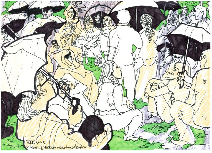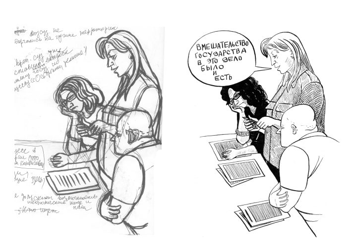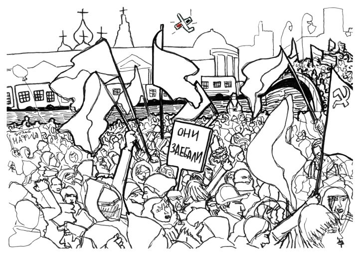 I started with drawing vulnerable social groups, and in 2012, I transitioned to drawing reportages about the Moscow protests, which seemed to me like a great historical event. Now I realise that I was working as an activist artist who was illustrating the political agenda. Actually, there is not much difference between an “activist artist” and a “Soviet artist-decorator.” Both follow the current political situation rather than shape it.