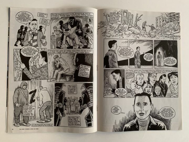 Lomasko’s follow-up, The Last Soviet Artist, began as a series of bulletins about the then-unfolding protests in Russia and Belarus, and the consequent wave of repression and censorship that followed in both countries. It took an unexpected turn in 2022, when Russia’s invasion of Ukraine inaugurated the full flowering of Putin’s authoritarian regime: a crackdown on political writers and artists of any kind, which forced Lomasko into her second exile to date as she managed to find a new home in Germany, where she lives today.