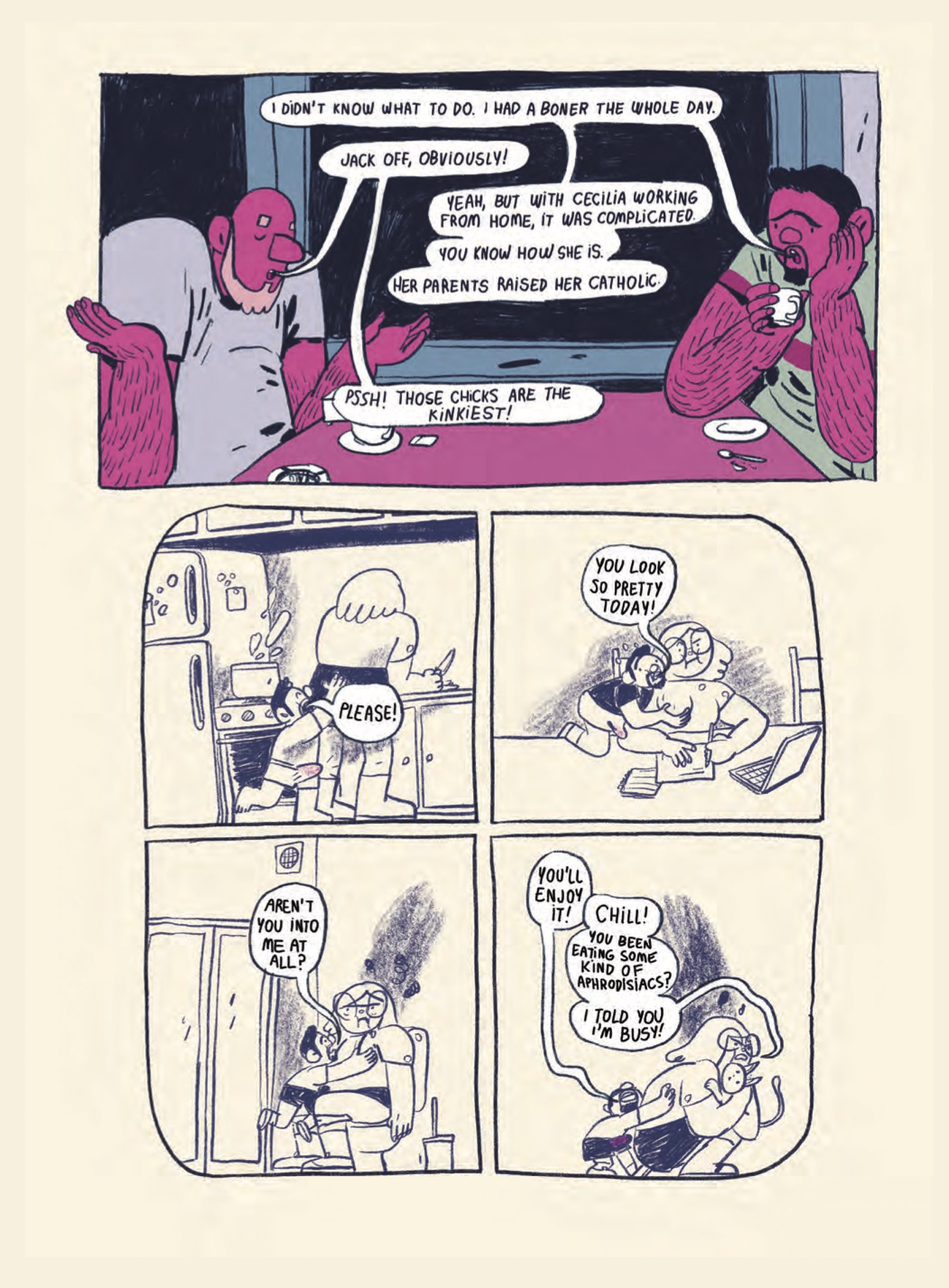 That’s not to say she’s not being fair. At least half the time views are offered through the male perspective, and quite accurately. Plus, it needs to be pointed out just how funny the book is. There’s also a whole lotta sex too, most of it occult-inspired. It’s there in the margins as well as the main story, with Otero showing all types of auxiliary action and ideas in proliferating little snapshot boxes.
