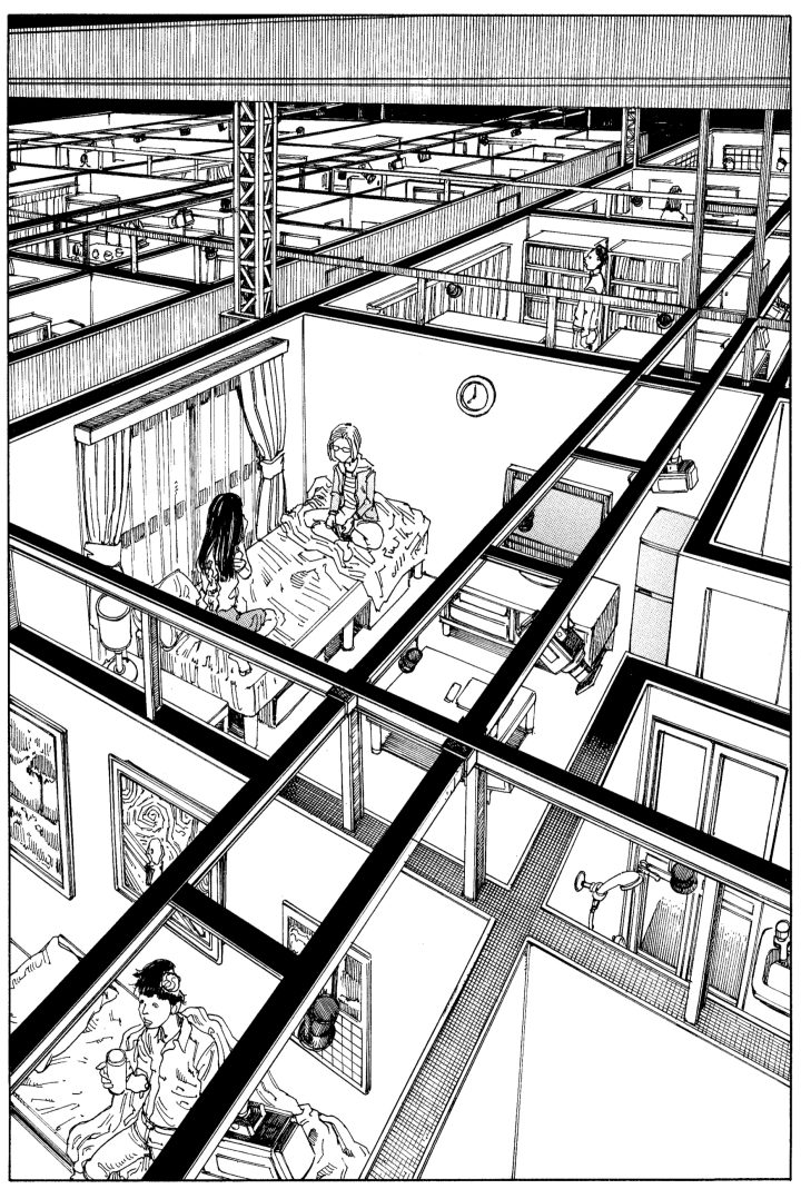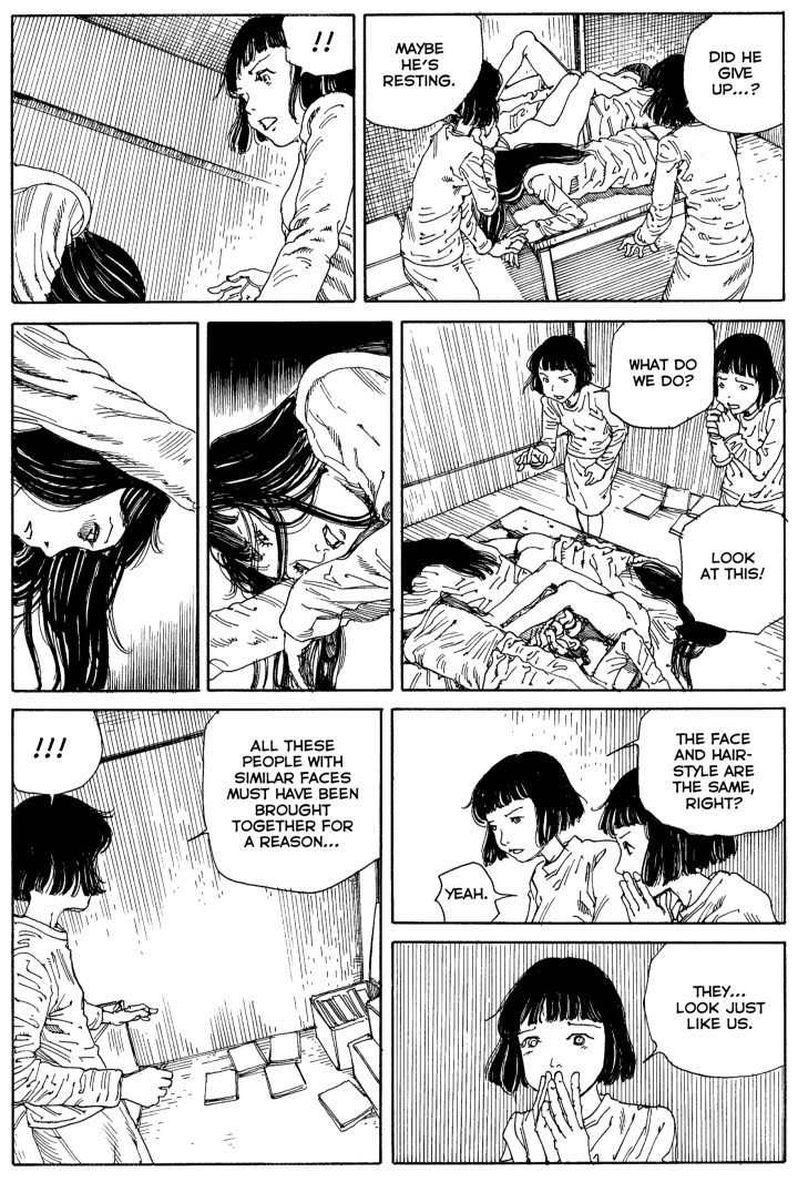 The first story in the collection “Labyrinth Quartet”, delivers just what it says in the title: Four young women, all similar but, teasingly, not quite identical in appearance, wake up in a building made up of a maze of mostly indistinguishable rooms. With no memory of how they got there, they attempt to escape while slowly discovering they are under pursuit by a murderous masked figure. “Labyrinth Quartet” starts out with a bit of Kago's trademark humor, with the women engaging in some downright vaudevillian banter, but it soon takes a black turn, and ends with a shocking denouement that folds a strong metafictional element into an ordinary slasher narrative.