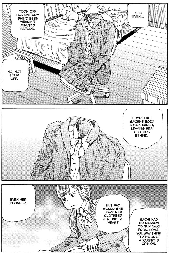 The following story, “Family Portrait” in a sense, is the most Kago-ish of collection, but for those very reasons, likely to be the one readers find the hardest to take. As a young woman tries to cope with family trouble including an ineffectual father, a pest of a brother, and most of all, a grandfather falling ever deeper into dementia and memory loss, everyone around her, from her friends and family to her neighbors, begin disappearing. This one most encapsulates both the erotic and the grotesque of Ero guro, but it also gets pretty gross at times, with humor that combines Groundhog Day with Benny Hill and an ending whose creepiness is undercut by a repulsive sexuality that's more exploitative than explicit. The weakest tale in the book.