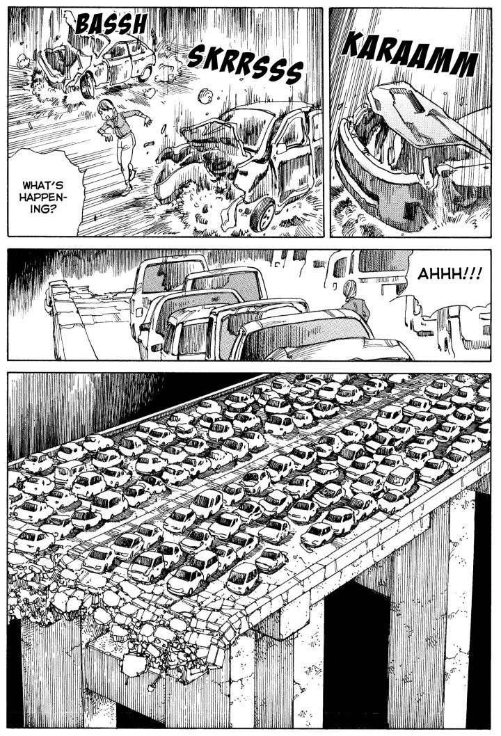 Finally, we get to “Blood Harvest”, the hootiest and best piece in the book, a great way to go out. Yet another of Kago's young female protagonists ends up getting involved in a situation where people found in undamaged cars having been killed in various heinous ways, and she remains the sole survivor. This is the most spoiler-susceptible story in the bunch, but it features not only the sharpest art in the collection, from its faces to its vehicles to its ramped-up broken bodies, but the wildest ride as well, throwing together elements of Christine, detective fiction, Cars, the Matrix series, Crash, and Kago's own unique perspective into a clanging, raucous blender. As the strongest of the four, a suitably deranged conclusion.