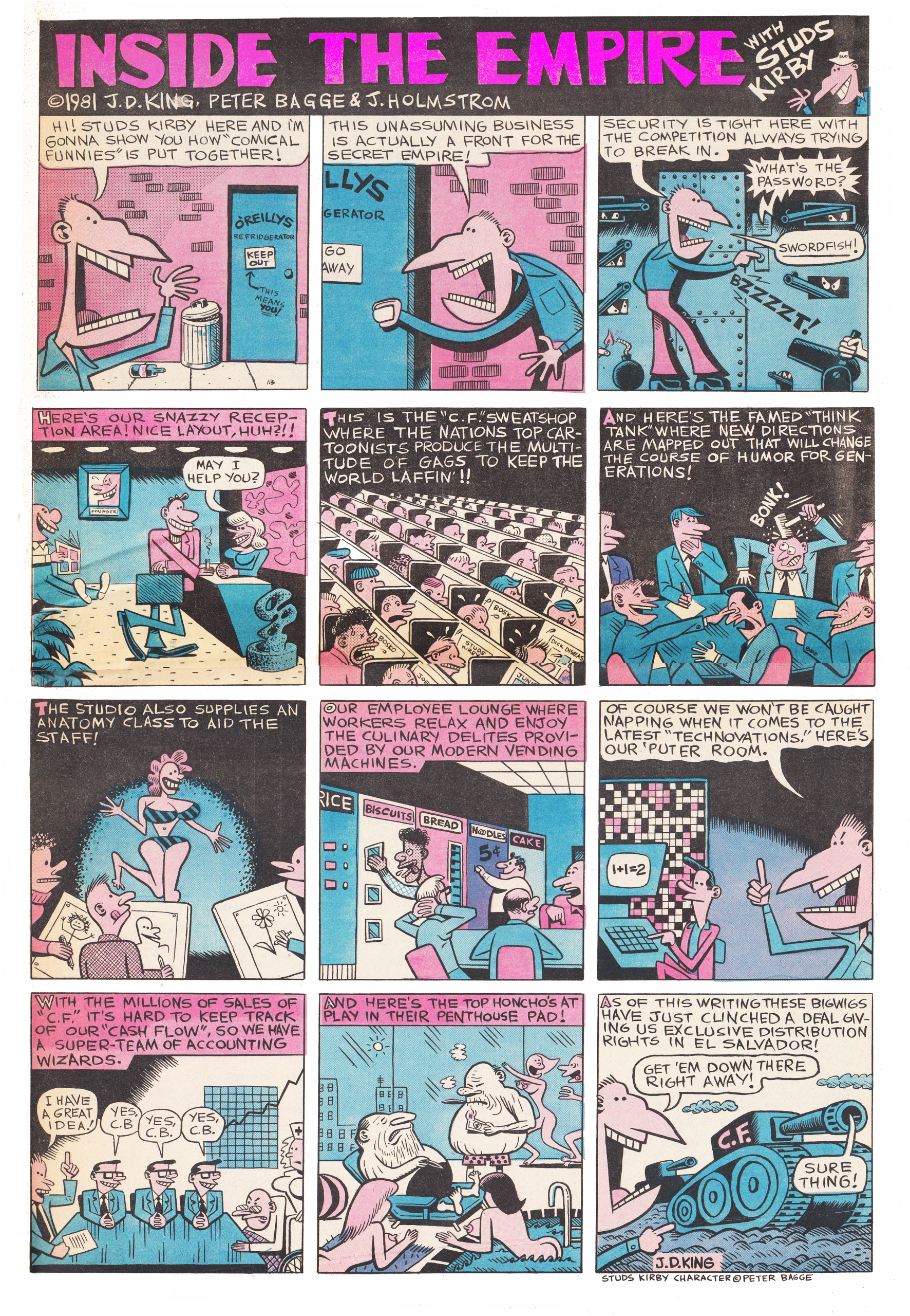 In Cooke's The Book of Weirdo, King said: "In 1980, after six years of trying to get published in underground comix, I got a break when I joined the Comical Funnies crew that's emerged from the wreckage of PUNK magazine: John Holmstrom, Peter and Doug Bagge, Bruce Carlton, and Ken Weiner. I hopped on board the second issue with some reprints of stuff I'd done for the Village Voice, circa. 1978."