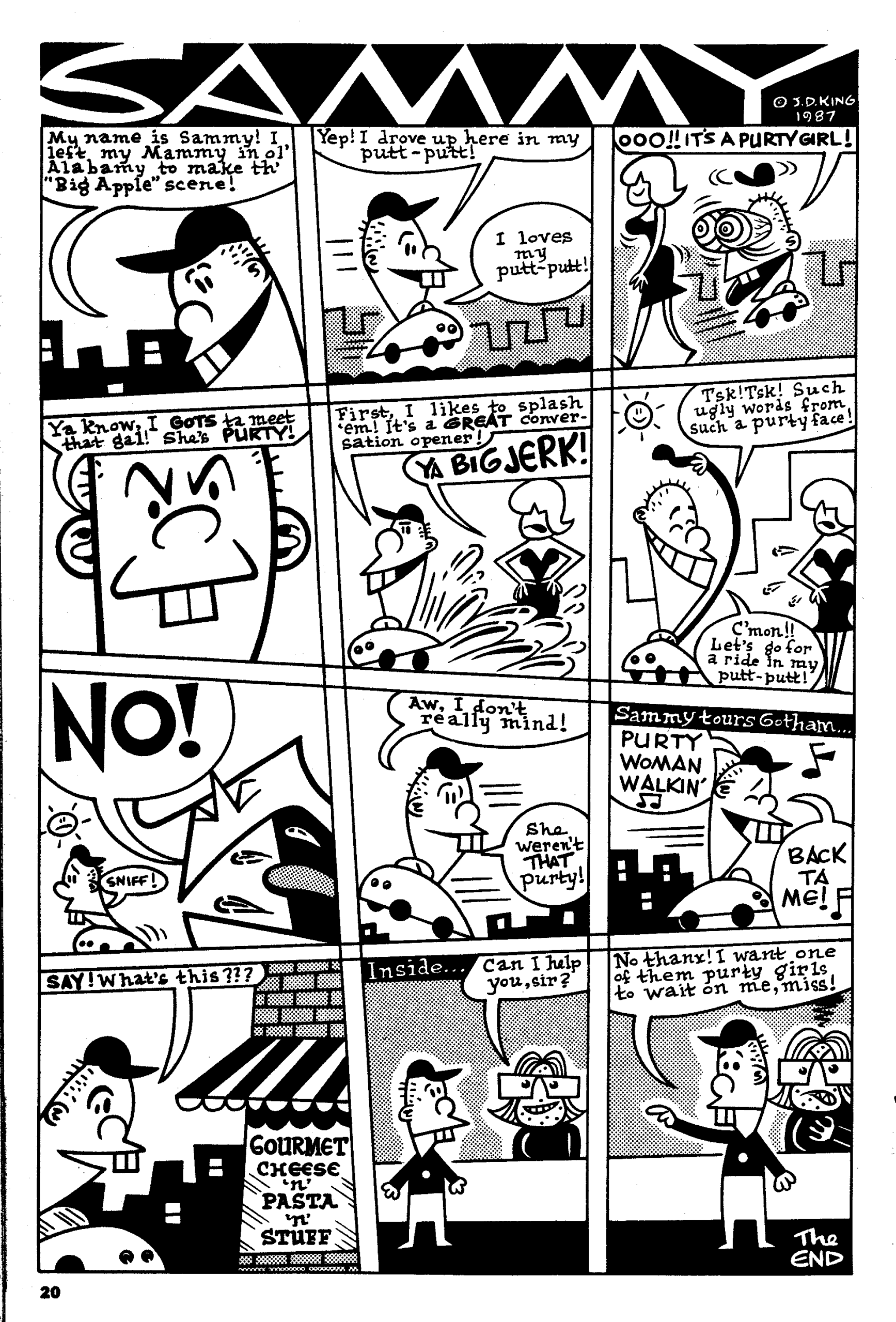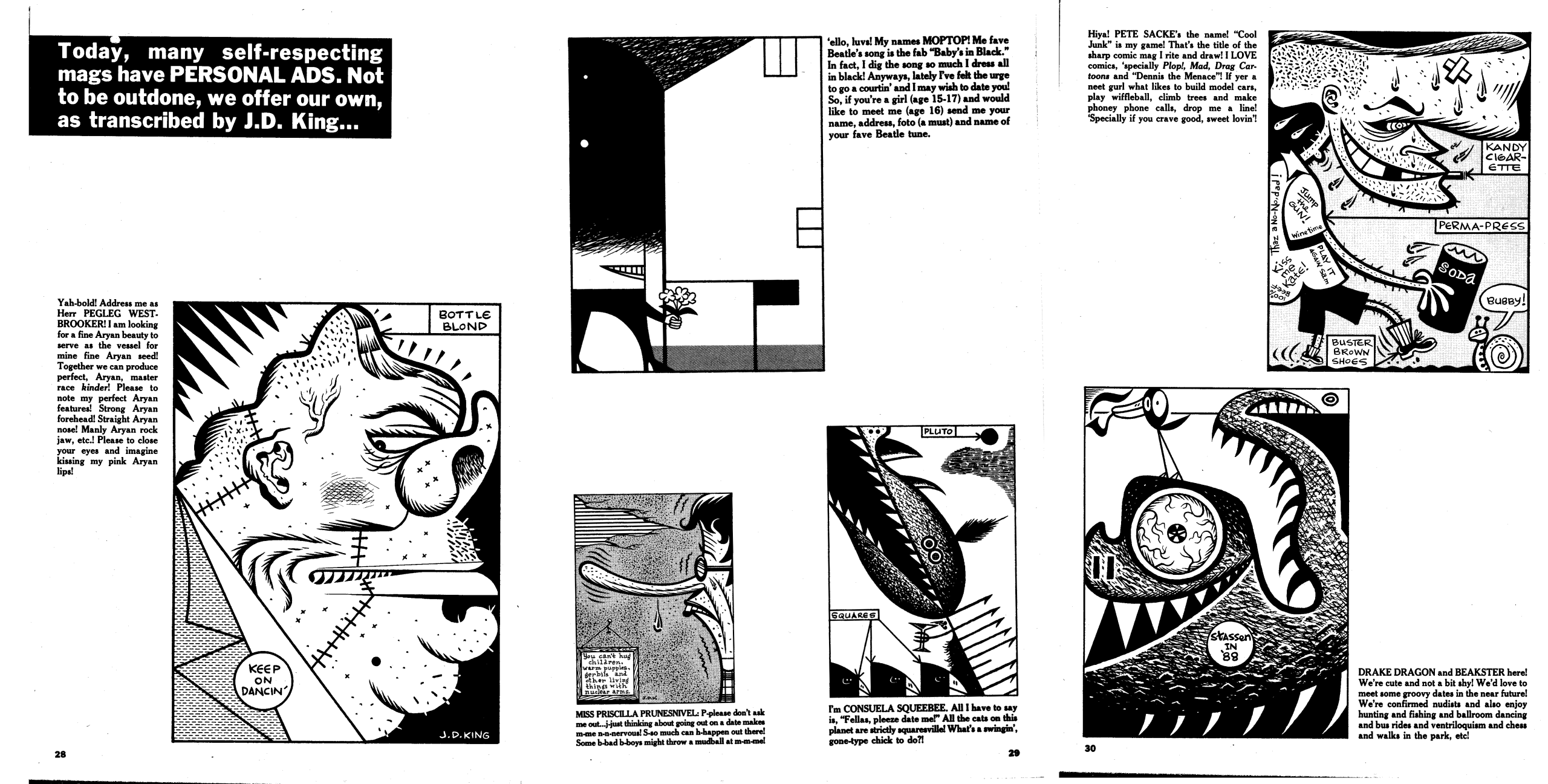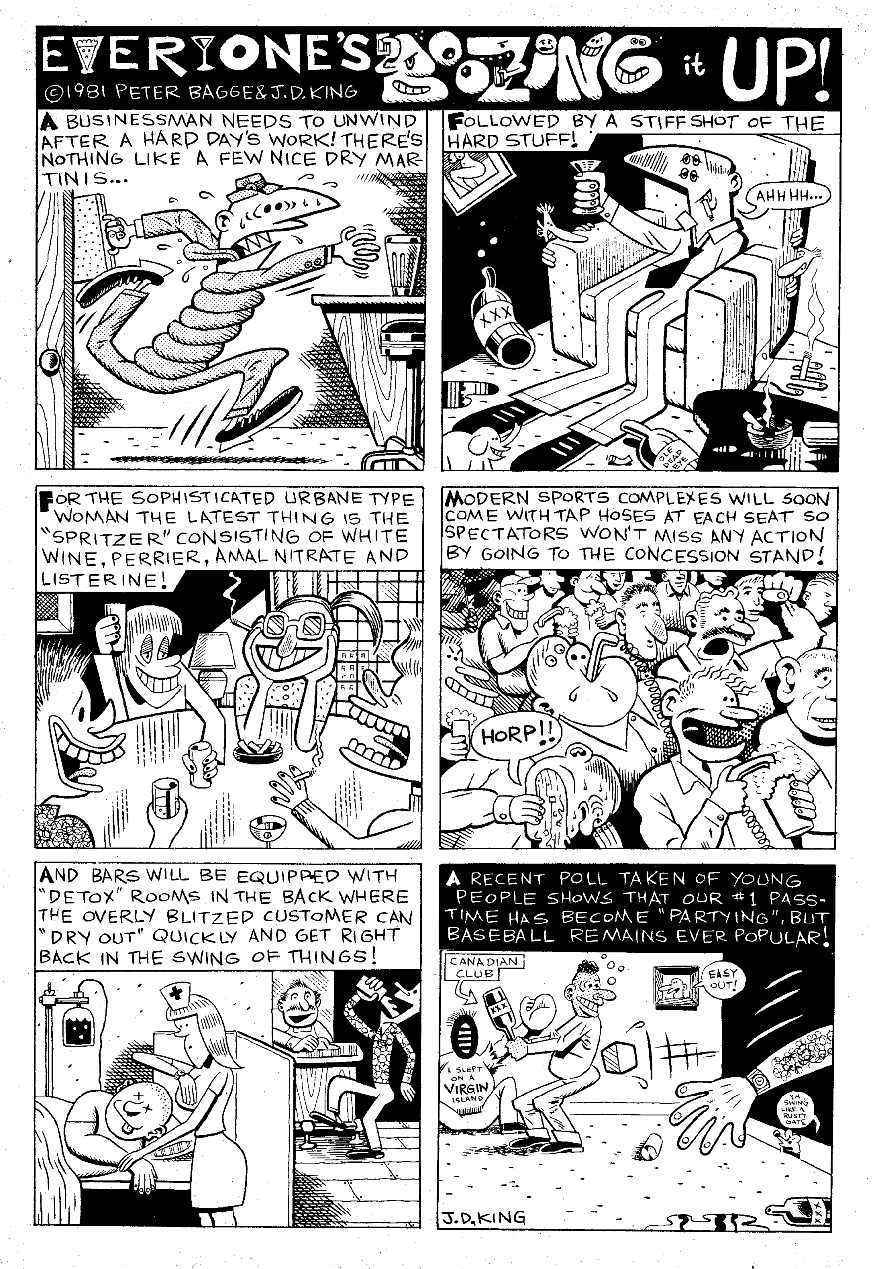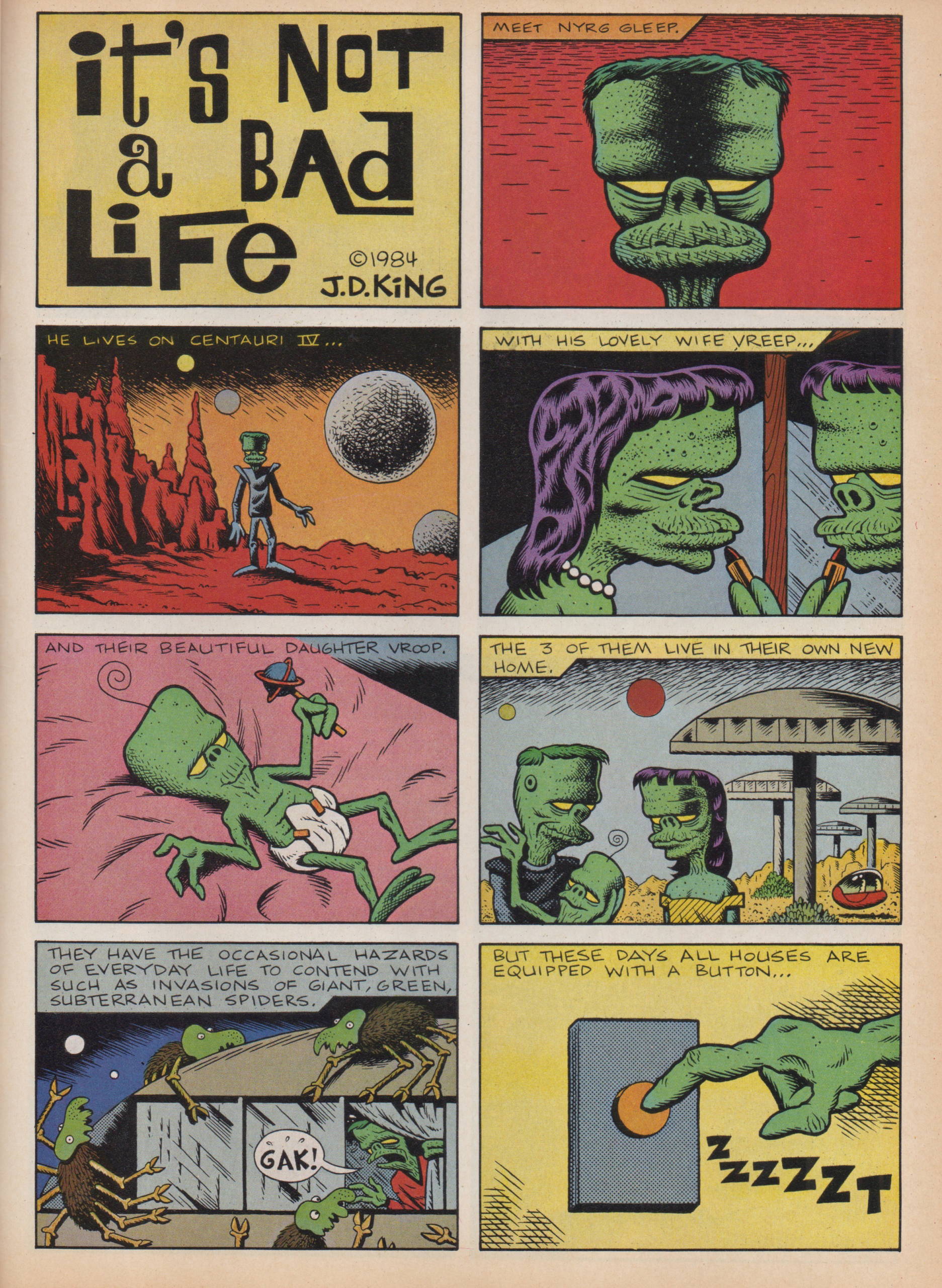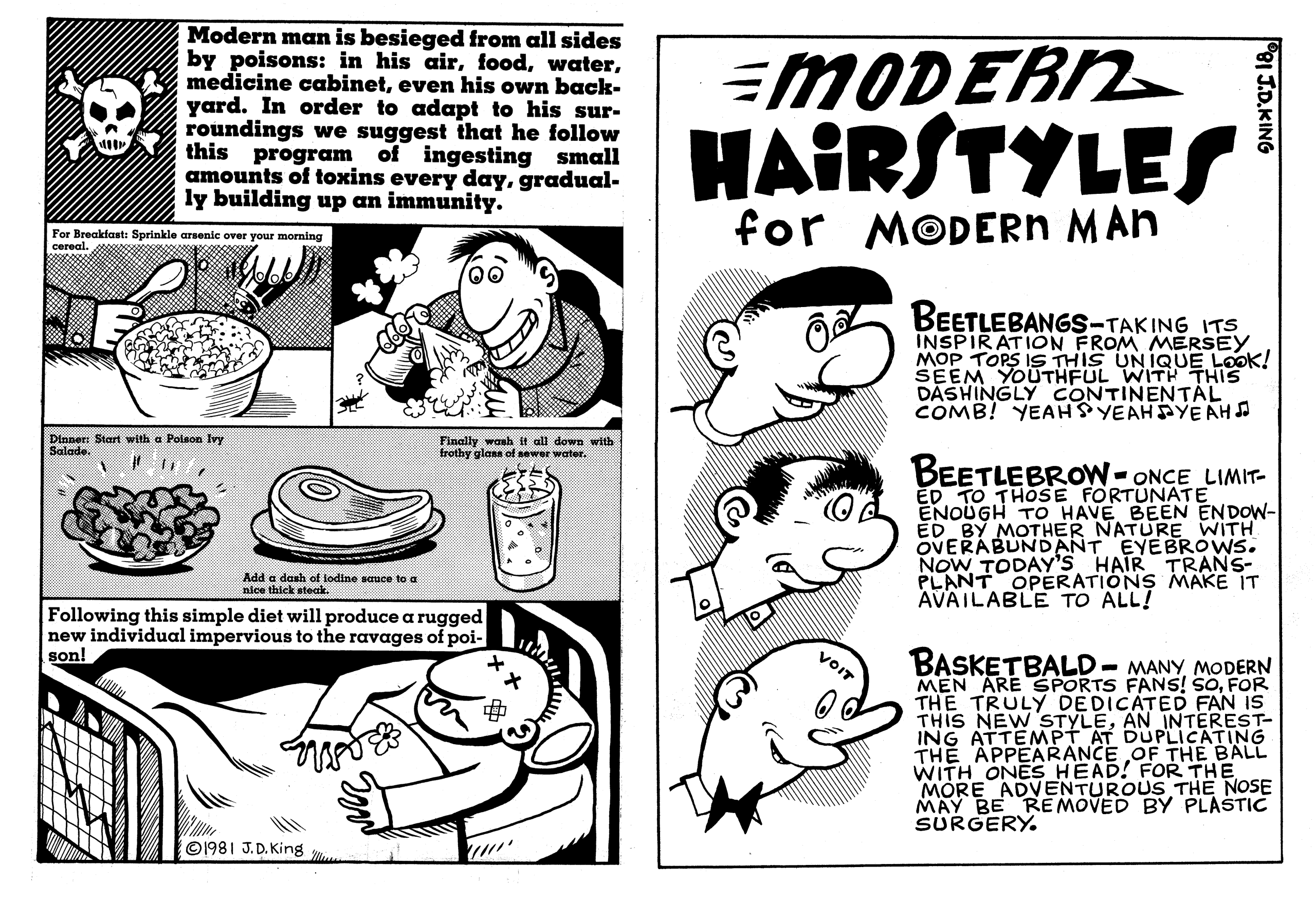 After I started publishing Comical Funnies with Peter Bagge in the early 1980s, J.D. King showed up with his stuff. His style fit in perfectly with the rest of the wacko stuff Peter and I were publishing, so we published his "Haircuts" page in CF #2, and ran several pages of his comics in the third issue. By then Peter and I were having disagreements about the direction of the publication; I wanted more magazine-style articles while Bagge wanted it to be strictly a comics publication. So we parted ways.