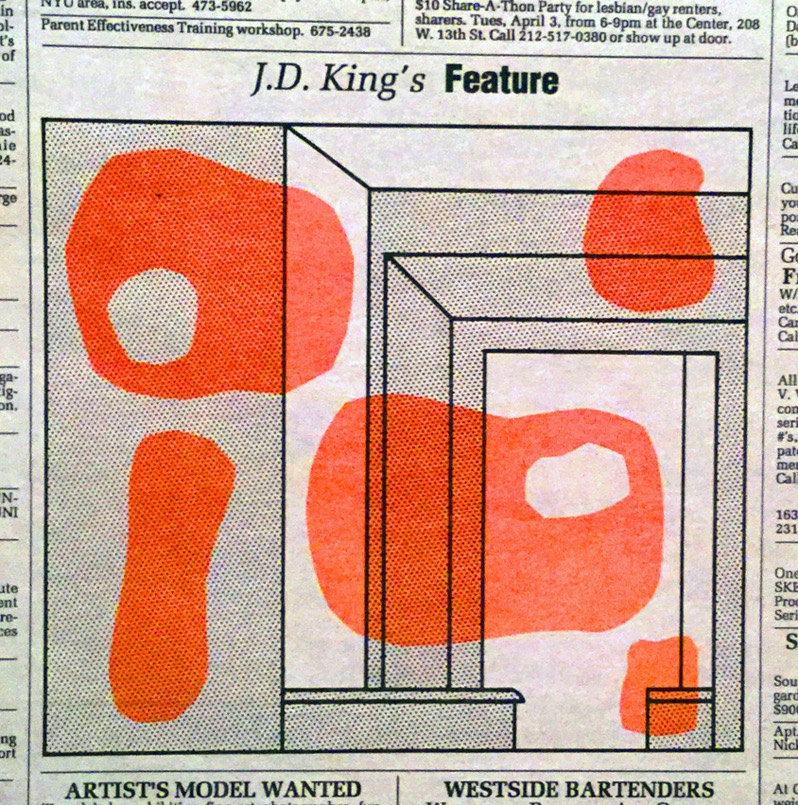 The Village Voice was a great employer of artists in the old days, and J.D. King was sauntering down Broadway on this sunny afternoon, his eye on the skyline, sporting an early Bill Evans be-bop look, when we had our first conversation. Though he moved to freezing upstate NY soon after, in 1994, the real J.D. was always a city-dweller, a skeptical, friendly flâneur.