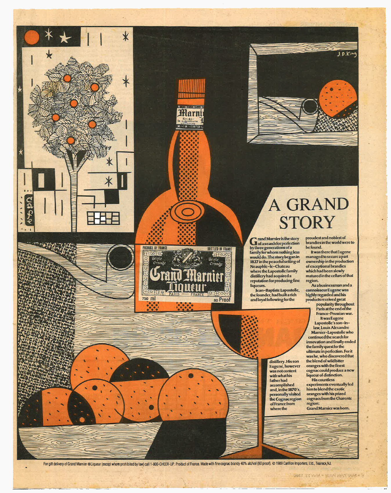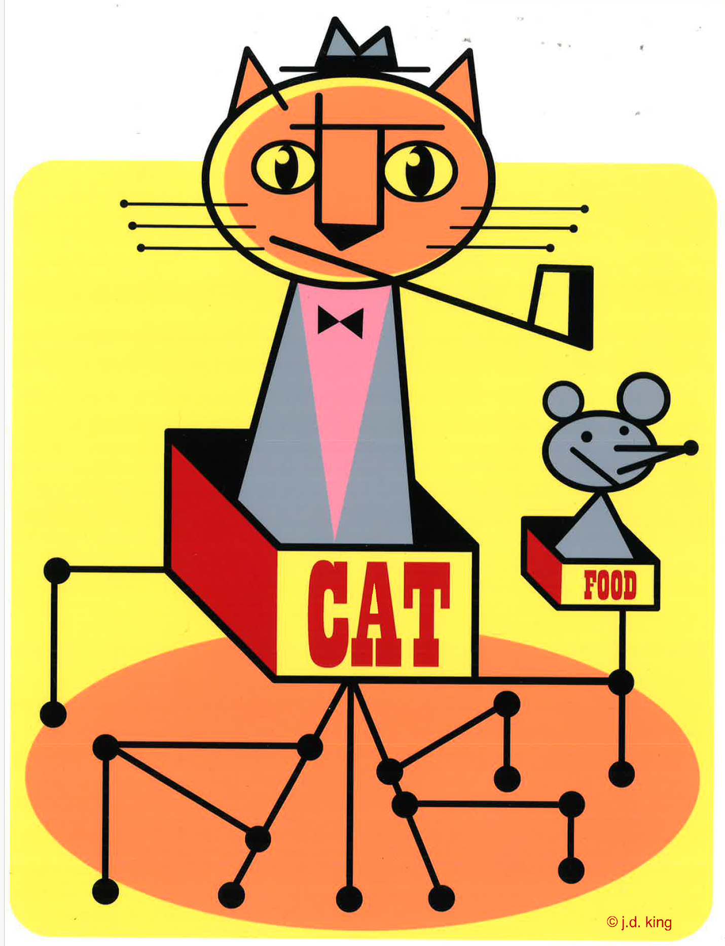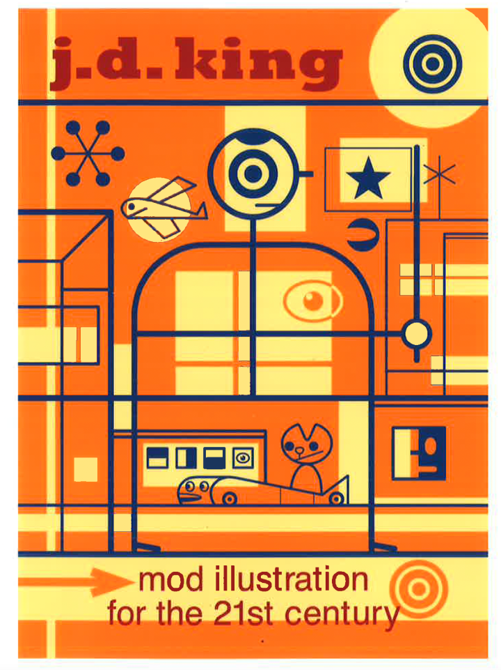 I first met King in the early 1990s at a party thrown for Harvey Kurtzman. I had been chatting with a friendly, nattily-dressed, very tall man in a sharkskin blazer and Poindexter glasses. When he introduced himself, he said, "I'm J.D. King." I looked at him and replied, "Of course you are." I was very familiar with his work and his be-bop presence perfectly fit his art's vibe. At the time I had recently acquired an early, bootleg, version of Adobe PhotoShop and had been playing around with the program's "shape" tool, a primitive feature that allowed the user to create simple, well...shapes–lines, circle, squares, etc. Somewhat as a joke, I suggested to King that he might consider using it for his illustrations, which at the time contained a lot of...shapes.