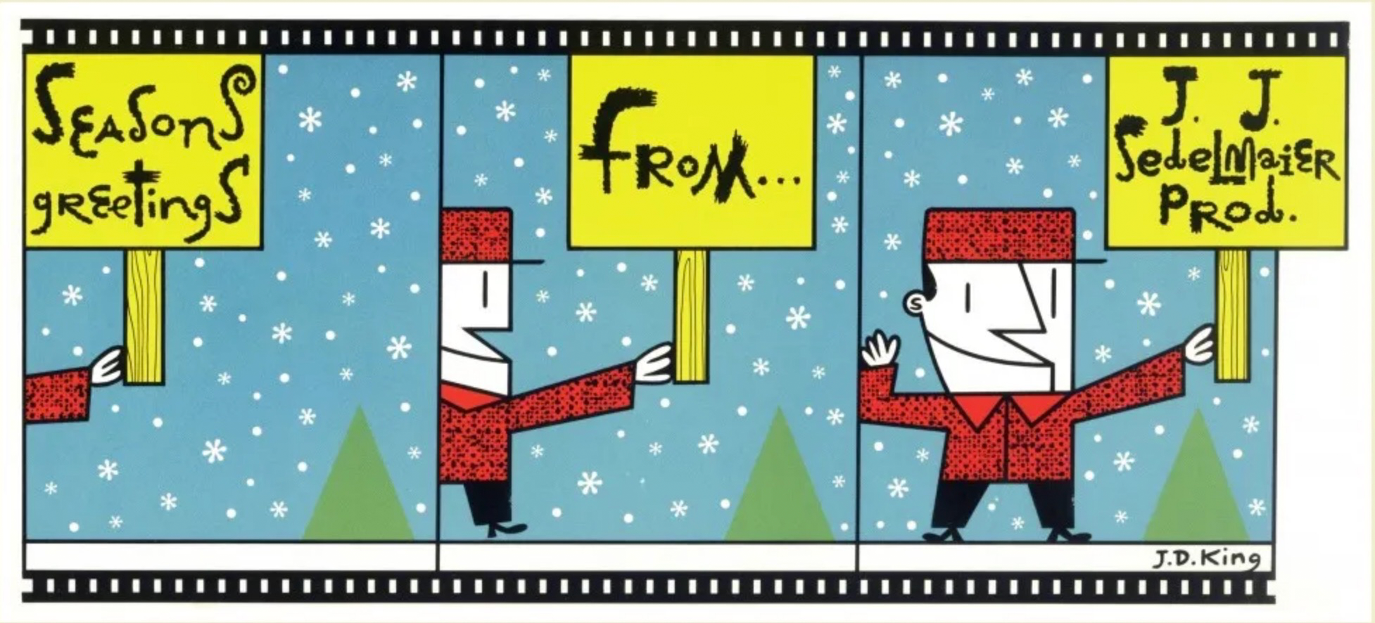 The next project I approached J.D. about was our first studio Holiday Card. After leaving The Ink Tank in 1990, my wife Patrice and I opened J.J. Sedelmaier Productions, Inc., and I couldn't think of a better way to grab people's attention than to have J.D. design an image for us to send out and announce our appearance in the industry. All I asked him to do was design a fun image that used a sequential foundation. Here is what he came up with: