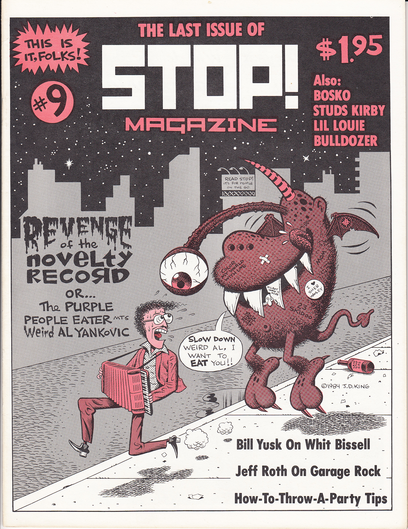 Peter and Ken Weiner published their own comic book [Wacky World, 1982], which led to Peter editing Weirdo for R. Crumb, while J.D. and I published STOP! magazine, a zine with articles and comic strips and advertisements. We published nine issues, but by 1984 decided to "STOP!" publishing the magazine. We were both happy that we came away with a few hundred bucks apiece! Not a lot of money, but it was nice to break even at the end of the day.