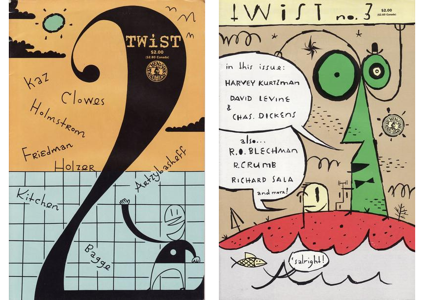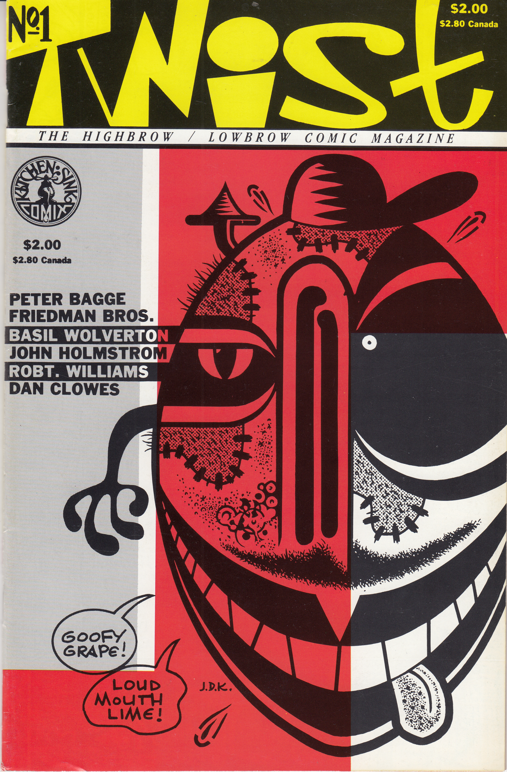 As Kitchen Sink Press’s publisher, I agreed to publish---and even contributed to---Twist, a short-lived post-underground anthology that JD pitched to me in the late 1980s. The black & white self-described “High Brow/Low Brow” publication contained comics and illustrations by the likes of Drew Friedman, Dan Clowes, Kaz, Richard Sala, Robert Williams, Patrick McDonnell, Peter Bagge, John Holmstrom, and others---even a non-cartoonist like Jenny Holzer---all testimony to J.D.’s persuasive arm-Twisting skills, since no one got rich from the page rates. He also included homages, reprinting excerpts of admired earlier generation talents Boris Artzybasheff, Basil Wolverton, Harvey Kurtzman, and David Levine. J.D. and I were definitely on the same aesthetic wave length.