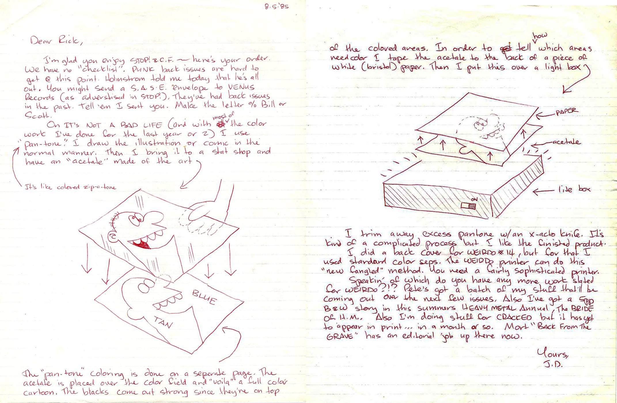One of my favorite letters from a cartoonist ever! I loved J.D. King's stuff in Stop! magazine, Weirdo, and Comical Funnies, but the explosive colors in a comic he did for Heavy Metal magazine in the mid-eighties called "It's Not A Bad Life" had me writing to him to ask how the heck he did it & he generously took the time to write back and explain his color separation process. I miss writing & receiving snail-mail with cartoon drawings on them! His cartoon characters had a vintage ad mascot/logo design feel to them but with storylines contemporized to be punky kinda like Kaz. J.D. King came out of the post-underground/pre-alternative comics school of “laugh out loud” funnies with the likes of Peter Bagge and John Holmstrom, exactly the kinda stuff I wanted to do, so he was a big inspiration!