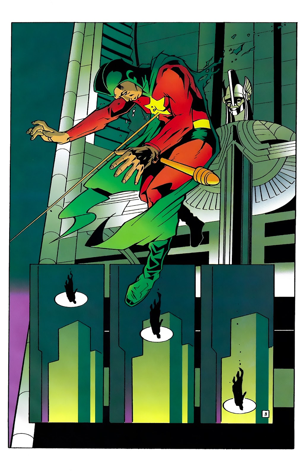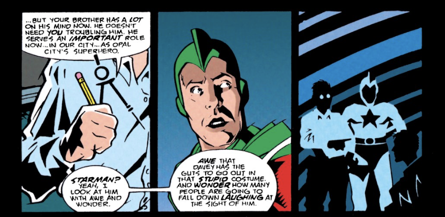For all the attention lavished on Robinson as someone who was able to incorporate so much comic book lore into the series, he was also able to take his own interests and incorporate this into Jack Knight’s personality and thoughts. Like a cultural magpie, Robinson was also drawing from literature (high and low literature, if that means anything and if you care) and managed to incorporate all of that into the very text of Starman. It wasn’t simply a question of the narration, but in Jack’s thoughts, in the fabric of the story. If you’ve read Dickens and Wilde, I won’t say that the comic makes more sense, but it feels like a part of the world. Other comics writers may make literary references or have characters talk about books, but few of them have ever been so influenced by literature, and made it a part of the comic, the way that Robinson did.