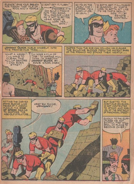 Meskin didn’t draw Quick the way that the Flash and other speedsters had been drawn, with lines behind them to give the impression of moving at a fast clip. Instead, Meskin would draw the character in multiple poses. An impression of speed owing more to Marcel Duchamp’s “Nude Descending a Staircase No. 2” than to other comics. That’s what made those old comics so visually interesting. These artists knew modernist art, grew up attending museums and studying at art leagues, they watched expressionist films, they studied the cinematography in Orson Welles and John Ford pictures, and they sought to pull all these influences into their comics. They were interested in light and design more than story, and if you read the stories, who could blame them.