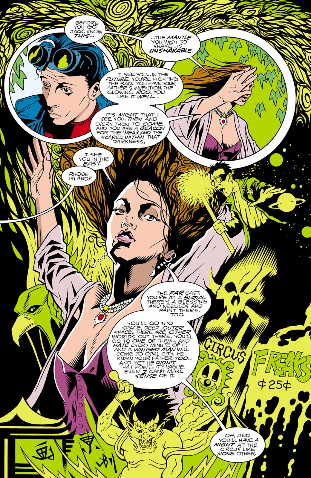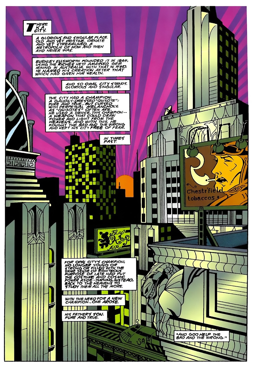 The first page of that first issue is a splash page of a fictional metropolis, Opal City, in all its art deco glory. An ugly modernist glass rectangle in the middle distance, an elevated train, billboards for “Chesterfield Tobaccos” and “Fly Koala Air.” This was a city that never was. A throwback to the old fictional DC Comics cities – Metropolis and Gotham, Keystone City and Fawcett City, Hub City and Midway City. There was a charm to them. Why not create a fictional city to play with? Perhaps that was an intentional nod to those who may have picked up the issue to tie into continuity, to the people who loved the Robinson-scripted miniseries The Golden Age, to past characters and series. Opening with this “metropolis of now and then and never was” set the series firmly in this world bridging the past and the present before they’d introduced the characters and the plot.