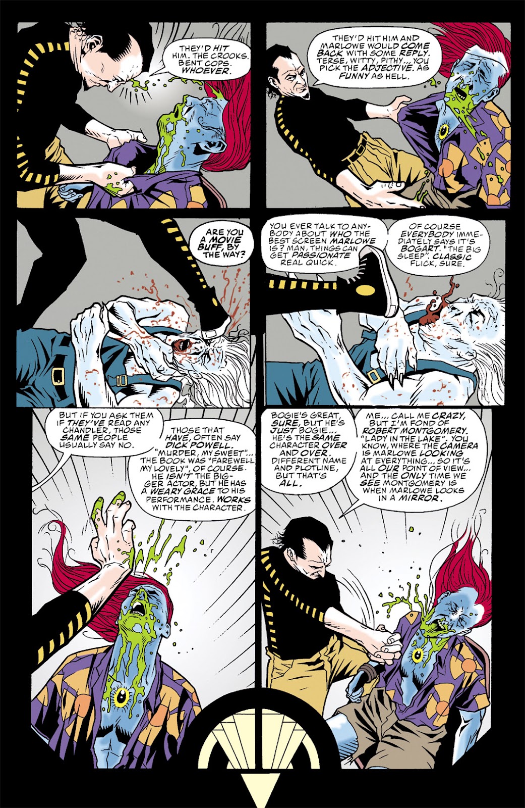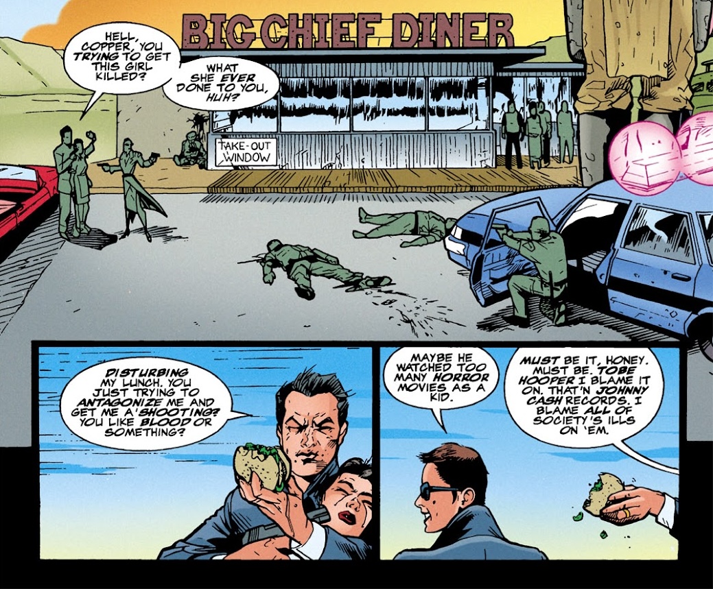 That can be deceiving. Robinson may be interested in collecting and make Jack a dealer with a deep knowledge of such things, but just because the pop culture ephemera that is in Jack’s head came from Robinson’s pen doesn’t mean it has any relation to Robinson. In issue #15 a villain is monologuing about Raymond Chandler film adaptations, and it would be a mistake to see any of those opinions as Robinson’s. Though he clearly possesses a deep knowledge of the subject. This was the '90s and pop culture monologues were all the rage. Blame it on Tarantino. After Pulp Fiction came out in 1994, it was years before audiences and Hollywood tired of the derivative dialogue driven crime films of this era.