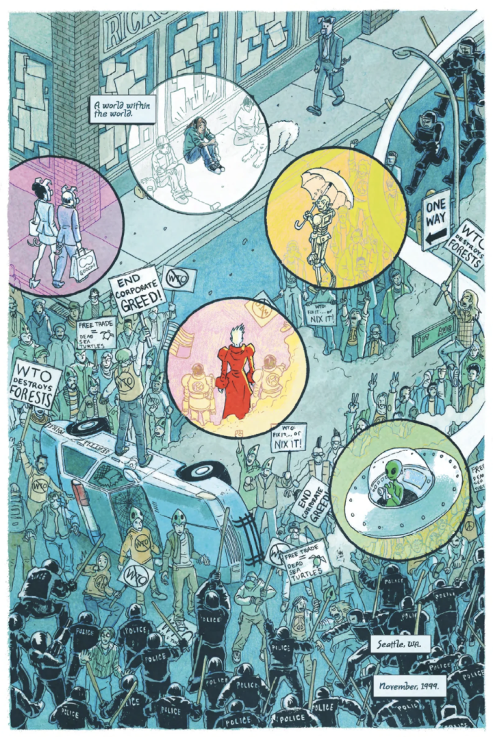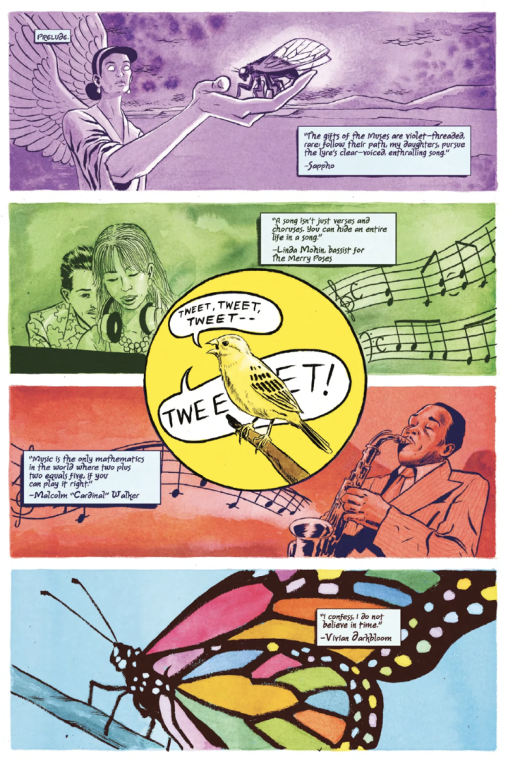 It makes me wince, because there’s a part of my brain that wants to track down every reference, to see what’s being pulled. Because I see enough to know there’s even more I don’t know because I’m not as conversant on the life stories of certain artists. If I think the guy sings like a cat, I’m going to move on with my life. Anyway. This is a rat’s nest of music history, shifted and reflected just enough as to allow for fictionalization. And the reason for that is practical, freeing the comic to use musicians as characters in the unfolding action, and to quoting from their oeuvres.