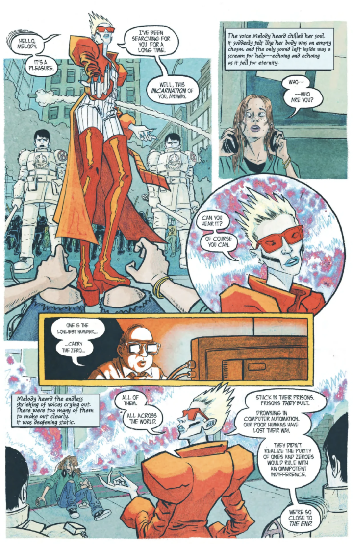 Is it pitched maybe for a younger readership? Feels that way. So I can only be so mean to a comic that, unambiguously, is going to hit with any kids who can find it and appreciate the jumbled music history lesson. It’s filled with young characters searching for missing parent figures and running from an anomalous multiversal menace, some kind of invincible square against which only our band of cosmic misfits might prevail. It’s based on the recorded pop culture of the twentieth century (with a bit of a spillover), which remains relevant in many circles. Posits the premiere of Kid A as being the last act of the twentieth century, which, sure. People hyperventilated about it at the time. Children, we didn’t know what trouble was.