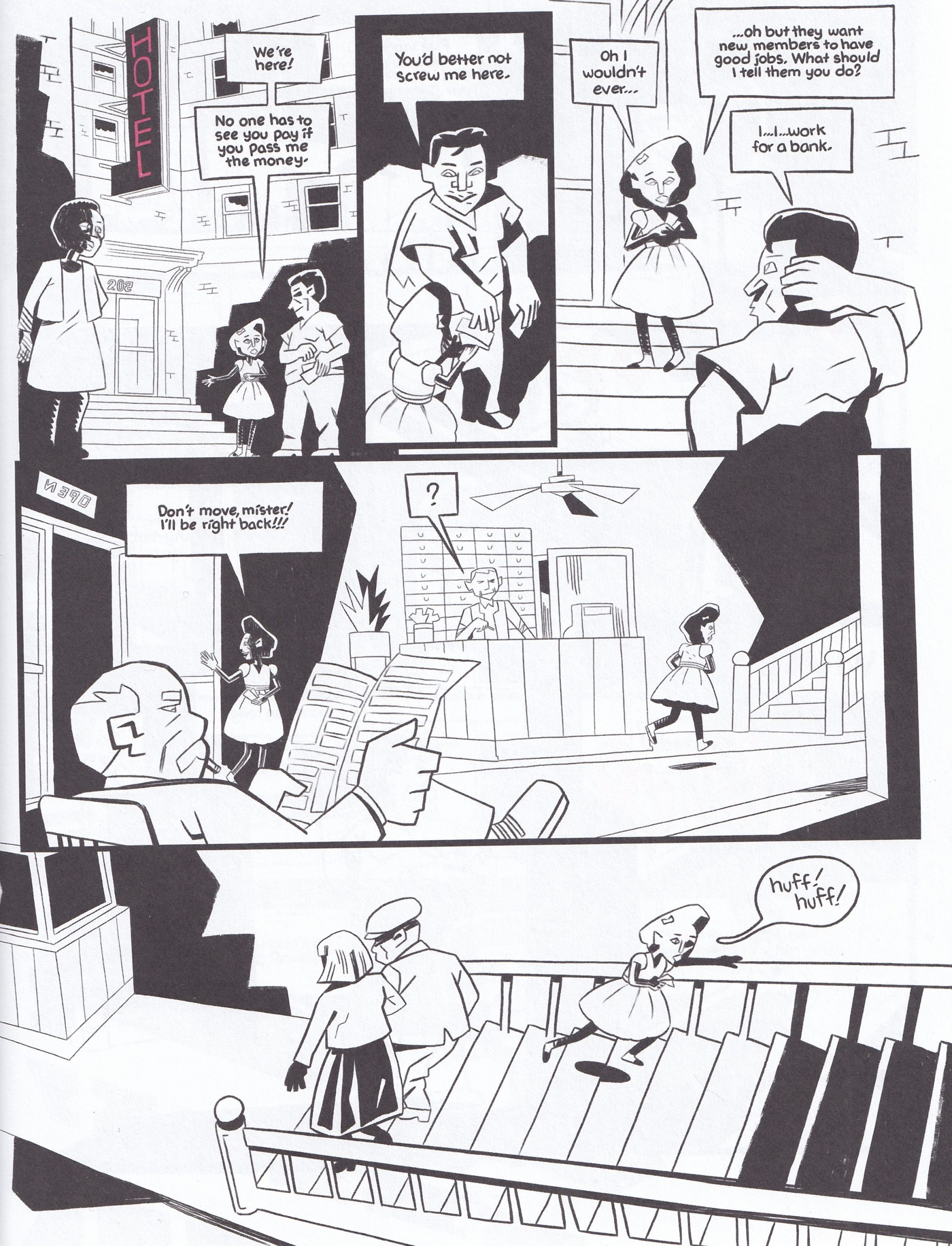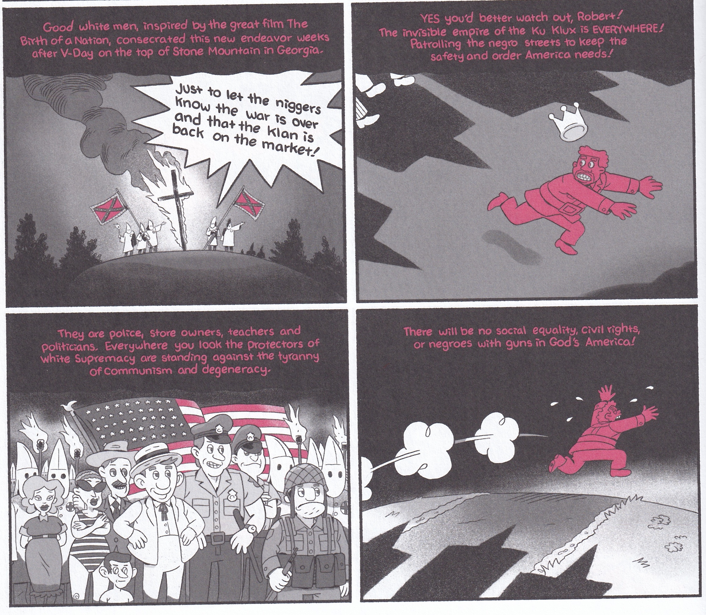 Passmore's linework, at least, is clean throughout, and the art is strangely disarming, even when depicting atrocities. The imagery moves smoothly between literalism and visual metaphor. And the book contains a handful of genuinely inspired compositions, most memorably a line of riot cops whose shadows reveal them to be hooded Klansmen.