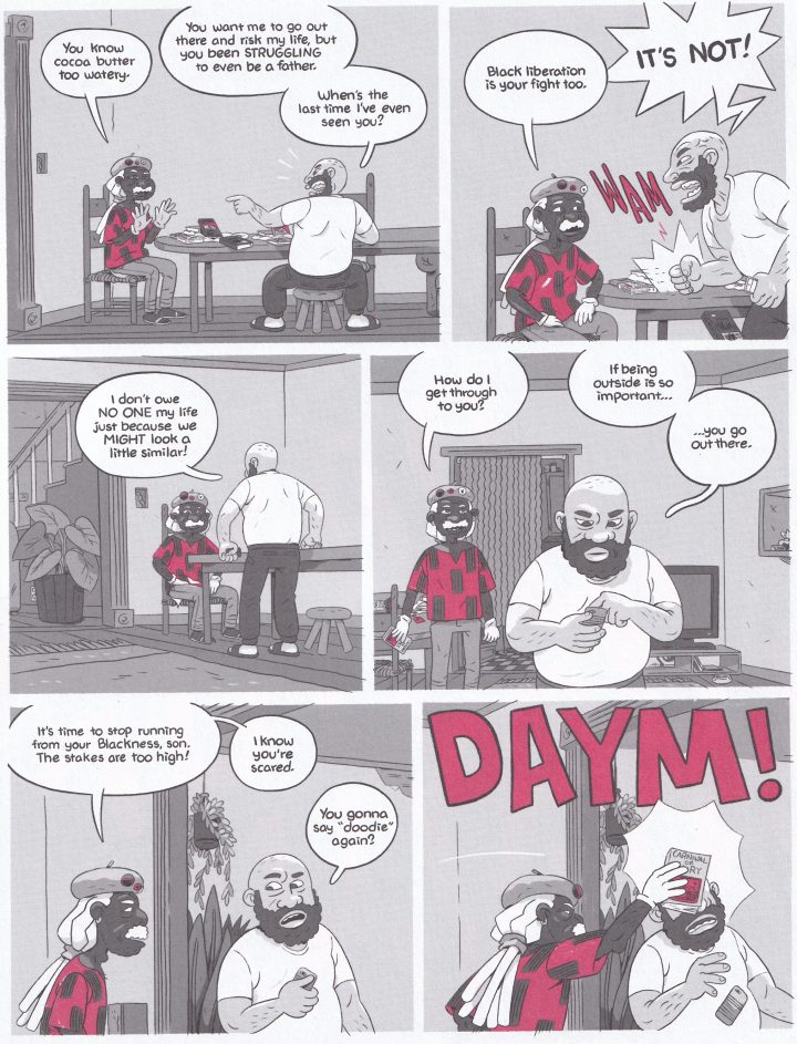 The narrative conceit is that Ben, the character, never quite understands what is going on; so he is constantly being lectured by the past luminaries (as well as a mythical father figure, who urges him toward activism). But my feeling reading the book was that we never hear enough of any one story to quite understand it either, that we don't have sufficient context to grasp what we are seeing on the page. It feels at times like the presentation takes it for granted that we will already know what it is trying to tell us. This assumption leads to some weird narrative choices — giving a lot of attention to Assata Shakur's life before she joined the Black Panthers, for example, but only a couple of pages about her time in the Black Liberation Army and almost nothing about her experiences as a political prisoner and an exile. The book does not so much explain the events it portrays as it briefly reminds us of them, one after another in quick succession. The story thus proceeds with the logic of a dream. In fact, Passmore cries out in one scene, "There's history everywhere, this is a nightmare!"