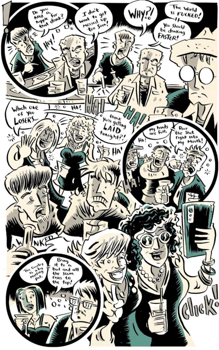 This attempted observationalism, though novel at first, over time gives way to voyeurism — not necessarily in the strictly ‘illicit’ sense (seeing as the characters are all either fictionalized or one-scene appearances, there is little harm done and thus little need for discoursing ethics) but nonetheless in the sense of the unaffected outsider. Krumpholz does fare somewhat better when characters recur, as both his readers and his own stand-in are given the opportunity to adjust their reactions to these characters over time: one friend, Den, starts off as a stock ‘drunk bar regular’ character, gaining depth as the consequences of his lifestyle become evident (one time he is jailed and Karl and Kelly have to bail him out, another time he coughs blood seemingly without noticing); another acquaintance tries to rob the couple on the street before recognizing them and trying to strike up chummy conversation. The tragic implications of said acquaintance's source of income being reduced to theft by assault are undercut when he later jokes about mugging them and makes an asshole of himself, prompting Karl to punch him in the face (the first time, notably, that Karl has taken action for himself). Even in these instances the very conceit of the comic, wherein Karl and Kelly are the exclusive subjects, means that other characters are disallowed from receiving their own autonomous focus, their very lives merely subordinate to Krumpholz’s.