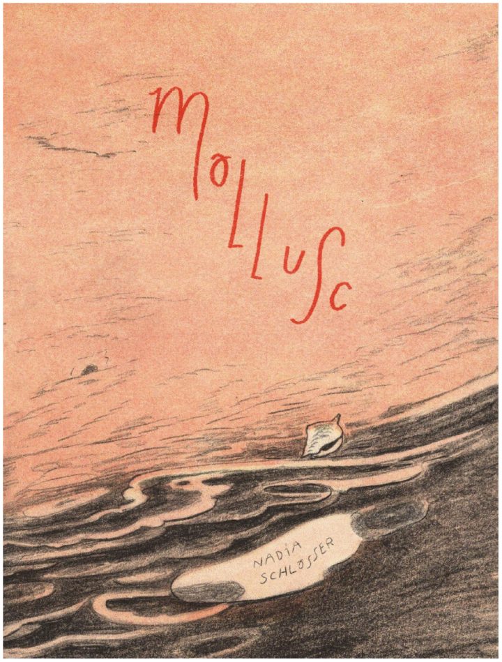 Mollusc starts with a walk on the beach: a nameless person—broadly femme, though the back-cover copy employs neutral pronouns—picks up seashells and presses them to their ear. After a succession of such attempts, a crab leads our protagonist to a bigger conch, and when they press it to their ear a mollusc emerges and crawls into their mouth. From this point, the protagonist merges with the mollusc and dives into the depths of the dark sea, literally and symbolically.