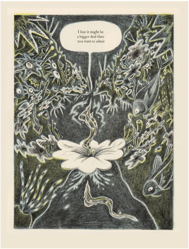 Schlosser’s intent is neither so lofty nor so nihilistic. Mollusc’s back-cover copy informs us that “[t]o live through a traumatic event is to undergo a transformation,” and that the comic “is a tale of a [person’s] escape from their past and their possible acceptance of the hurt they carry with them,” thus establishing both theme and (ultimately life-affirming) tone. In pursuit of this theme, many of the protagonist’s underwater interactions feature oblique references to trauma: an eel offers words of comfort, while an army of crabs castigates them and blames them for what happened (though it is not said in as many words, it is telegraphed that the trauma is of a sexual nature). But Schlosser—inadvertently, and similarly to Krumpholz—speaks in generalities: the narrative occurs entirely in the present, with no indication of the protagonist’s life outside of their trauma, and as they are carried from one encounter to another they are given neither any defining characteristics nor any opportunities to construct themselves through action. The reader is thus given little in the way of concrete detail — little in the way of emotional recognition.