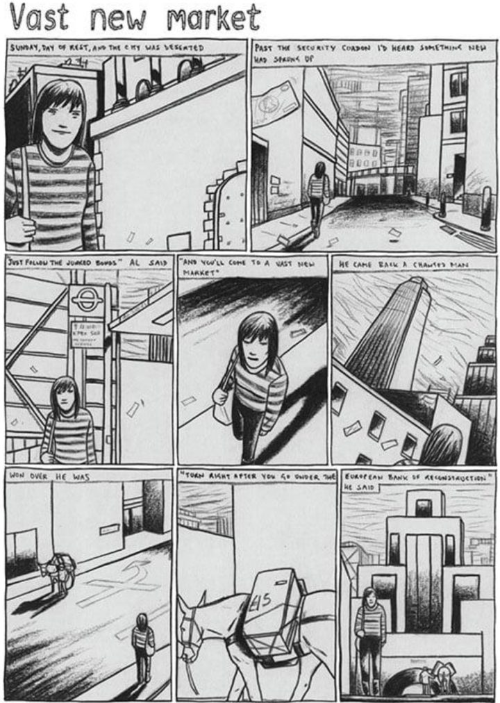 Swain’s approach is colloquial in the extreme. For example, as the protagonist of the first short, “Vast New Market,” looks at an automatic rifle in a street market, the vendor tells her: “It’s dear… fun though, hey imagine the Waco style shootouts!” Grammatically incorrect, to be sure, but, for a cartoonist like Swain, whose work is extremely rooted in naturalist observation, this feels like the only option: bare-bones and unrehearsed. Susan Sontag comes to mind: “It’s not ‘natural’ to speak well, eloquently, in an interesting articulate way. People living in groups, families, communes say little—have few verbal means. Eloquence—thinking in words—is a byproduct of solitude, deracination, a heightened painful individuality.” And communal living is, in fact, perhaps the key component of Swain’s work; her short works in particular—many of which are collected in the Dark Horse collection Crossing the Empty Quarter, which readers are heartily encouraged to seek out—often focus on a singular, fleeting shared moment, achieving precisely that specificity that eludes the previous two cartoonists.