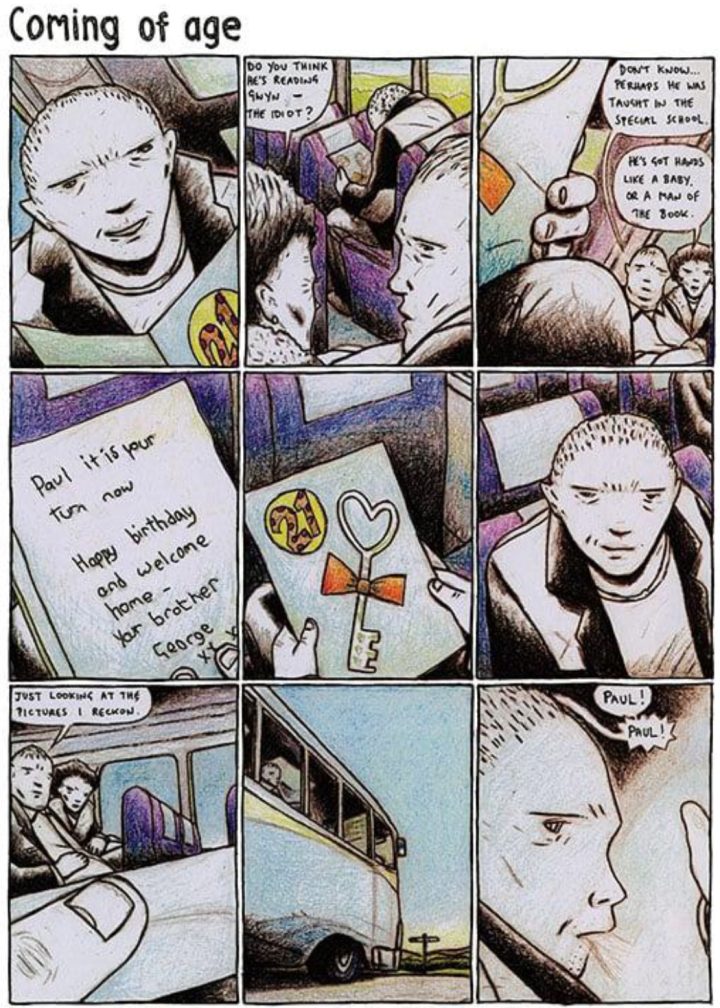 Where the protagonist of “Vast New Market” is inherently a voyeur—she visits the market not out of any necessity but because a friend of hers raved about it—the second story, “Coming of Age,” is a homecoming. As Swain returns to the fictional Welsh village of Llanparc (the setting of all three of her graphic novels), she switches from monochrome graphite to colored pencil, rendering the Welsh countryside in pale, sun-bleached tones. The protagonist, Paul, is a young man with an intellectual disability who returns to Llanparc to work on his family’s farm. What’s interesting is the dynamic between Paul and the world around him. A nearby couple on the bus regards him with a mixture of pity and cruelty, referring to him as “the idiot” and alluding to “the special school,” and as the husband talks to Paul about his upcoming employment, enumerating the duties entailed over the better part of two pages, the reader increasingly feels for Paul: the impression that forms is that he is in over his head. And yet Paul seems entirely undeterred—stoic, even—as his brother hands him his new work jacket. It is on this moment that Swain chooses to end her story, before her protagonist can get to work, and again the reader is forced to rethink their positions: it is entirely possible that Paul is, in fact, doomed without knowing it — but fundamentally it is an assumption sullied by the cruelty of, again, the unaffected spectator.
