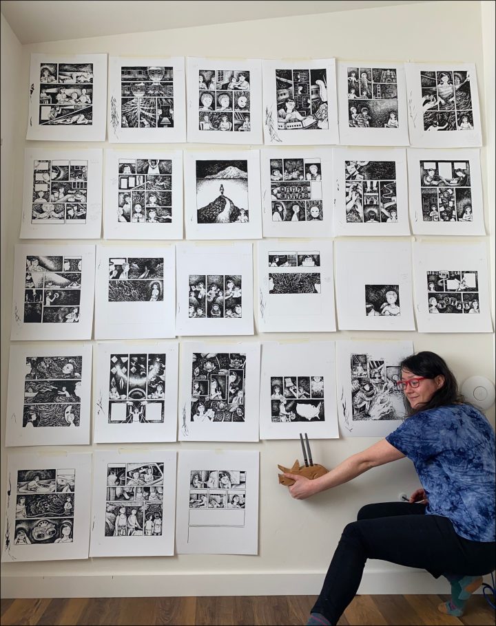 Basically, I made a 4,000-piece jigsaw puzzle by carving each piece by hand, and told my editor she was just gonna have to trust me that it was gonna fit. And against all odds, it…did? All the text boxes and speech bubbles were digital layers added at the end, so the way I edited the text involved copying and pasting the text from the finished pages into a word doc, which was when I found out how many words it was (it was about 60,000—way more than most graphic novels). We did line-item edits from solely that text document.