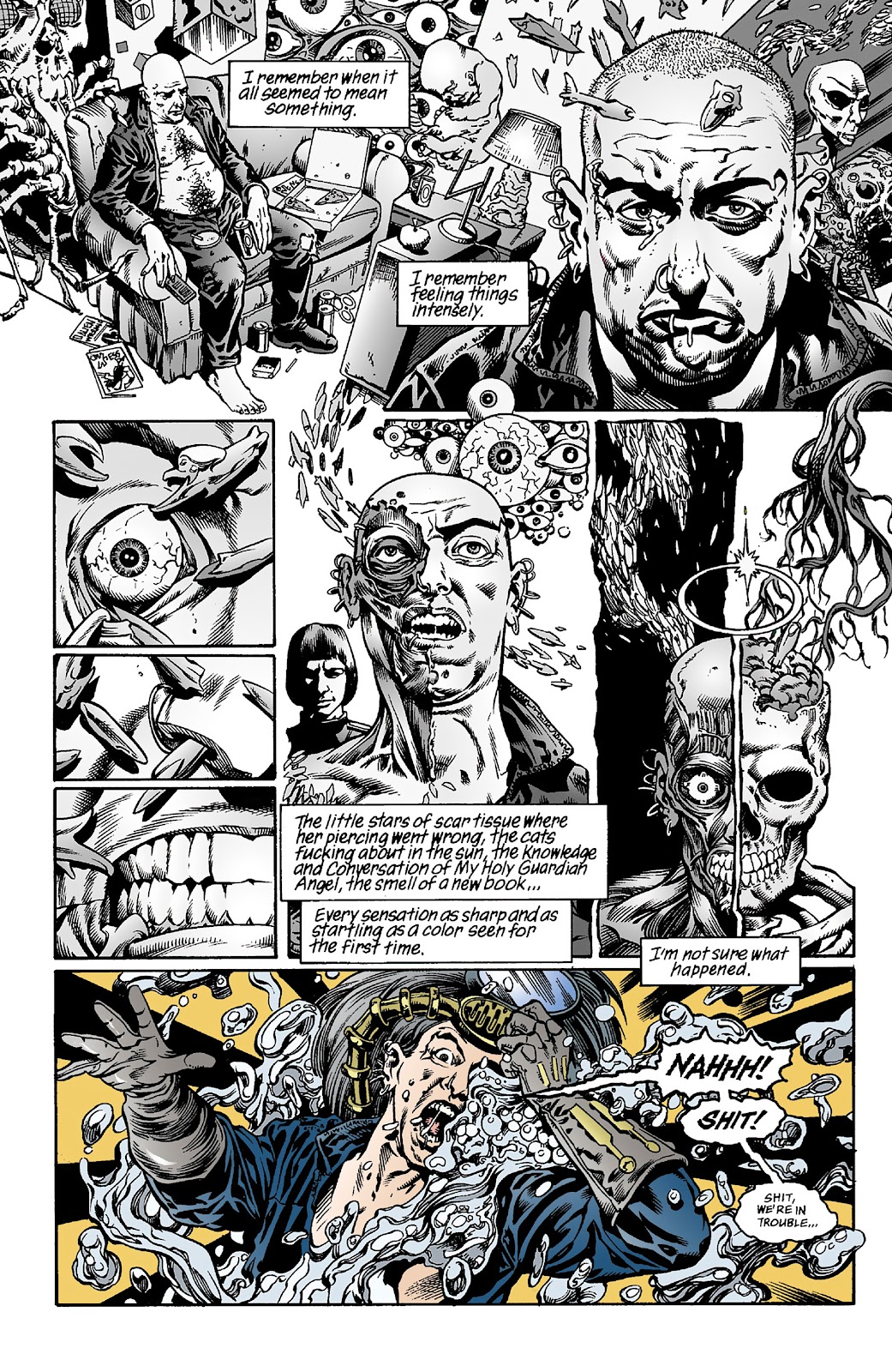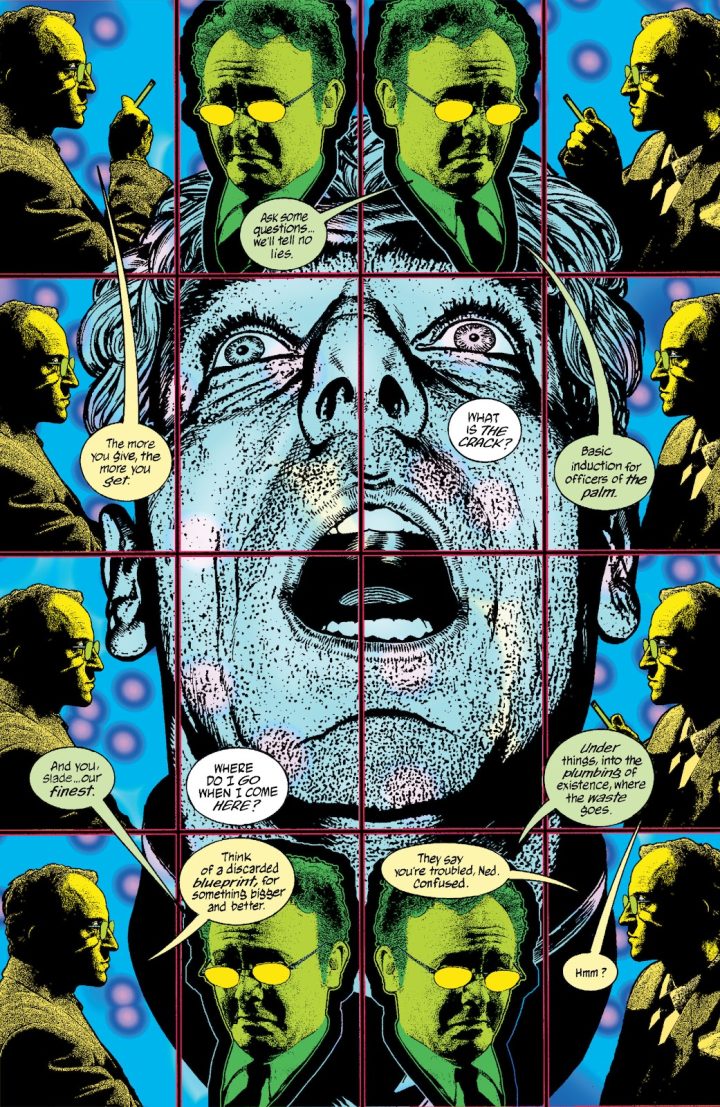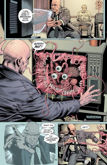 I think you can see Feely as King Mob. I wanted of it to be like the two shows Patrick McGoohan did, Secret Agent Man or how its known in Britain, Dangerman, and The Prisoner. The Prisoner is this super cool psychedelic spy show to end them all, but it’s like a sequel to Dangerman because the character he plays in The Prisoner, even though he’s only known as “No. 6,” it’s kind of the spy John Drake from Dangerman. So, I wanted that relationship between The Invisibles and The Filth as well. Suddenly this could be King Mob. Lost in the Qlippoth, lost in an identity and suddenly it’s that life. And there’s even a little bit in The Invisibles when King Mob’s being effected by the magic mirror that the bad guys are using, the kind of psychic poison. He sees himself and he looks like Greg Feely. Chris Weston drew the sequence in The Invisibles. It’s King Mob sitting. He’s overweight sitting there with a beer in his hand just watching TV and the TV just has a huge eye watching him back. There are pipes coming out his head funneling away all his thoughts. The Filth grew out of that one picture. Here’s King Mob, fucked. After the battle has been lost and he’s just sitting there watching TV.