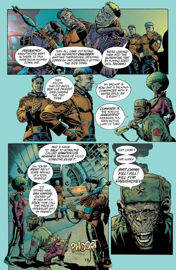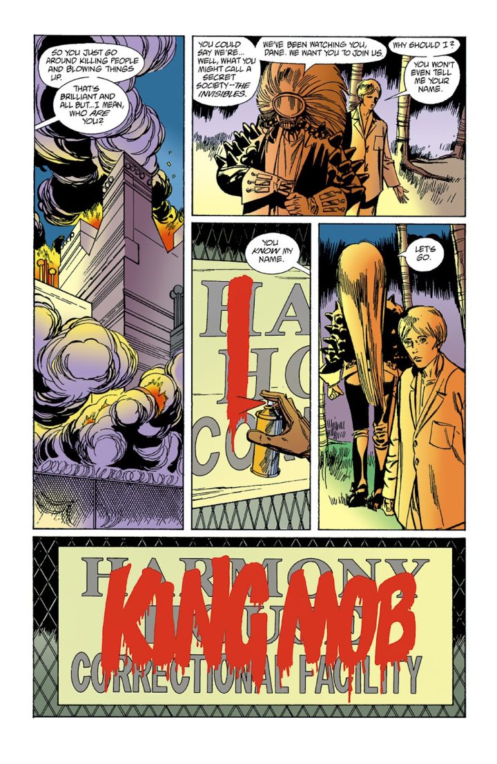 Grant: We are composed of bacteria. Much of our body mass is bacteria. They outnumber us. In The Filth it says, “How much of your is their thought? Can you be sure?” When you feel depressed, bad things come into your head. You put yourself down. You see yourself in a bad light. Is that them talking? Or is that really them? Again, it goes back to The Invisibles, issue two, when King Mob’s disguised and he’s up in a box just shouting at the passersby “When was the last time you had a thought that wasn’t put there by them?” And I think that’s a really important question for us all.