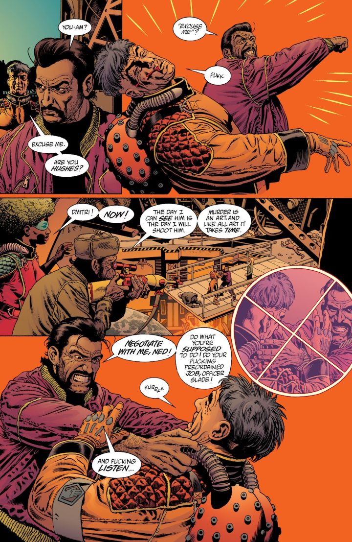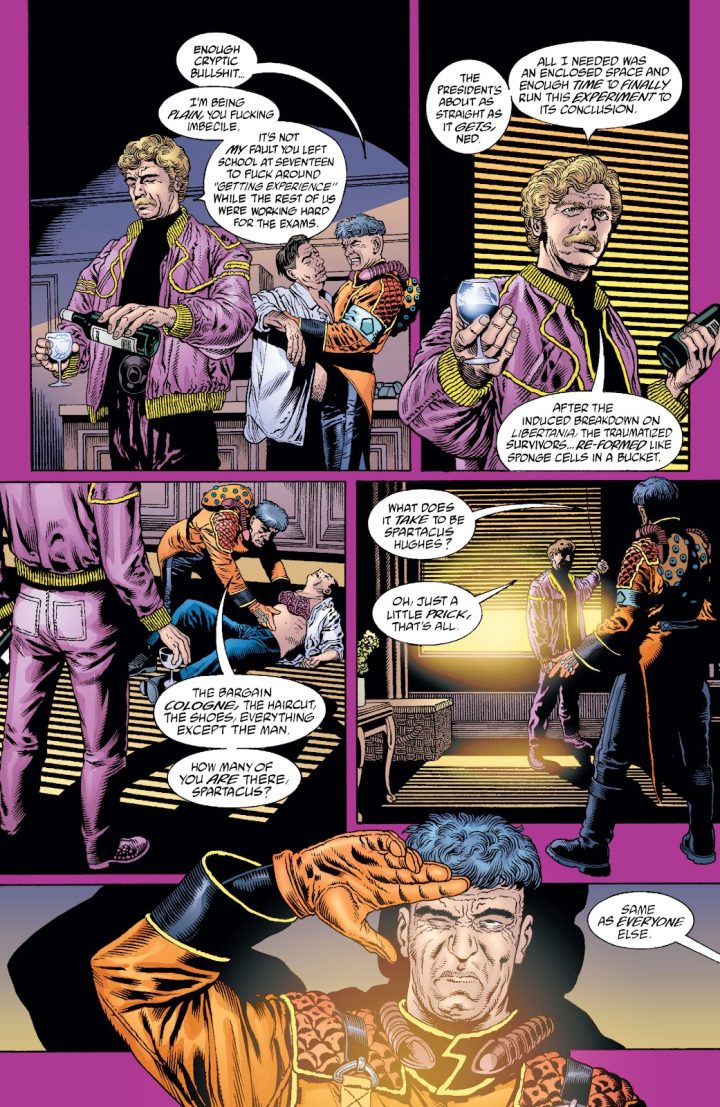 Spartacus Hughes was the idea of a viral man. It seemed like a really good spy notion. As you say, Greg Feely in the story seems like this normal guy with a sick cat. Then when we discover that no he’s not, he’s actually a para-persona, which is a fake personality that you inject. He’s really Ned Slade who is this big-time negotiator tough guy from the Hand, or so they tell him. This notion of the personality itself being viral being transmissible. I thought if Ned Slade was the alleged para-persona what happens to the rogue para-persona? Who gets out and who can replicate itself through lots of bodies so that’s what Spartacus Hughes became. So whenever you see him, he’s a different guy each time because the personality is a virus and its moved on to a new host. He’s a great character. I loved him. He’s a bastard. It's just the way a virus would look at us.