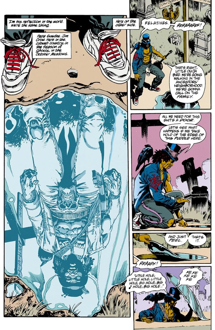 Yeah, I made contact with the Vodou Loa Papa Gede, or Baron Samedi. I got on really well with Papa Gede. That’s why he went into The Invisibles and the Jim Crow character became an avatar of Papa Gede. However, that led me into some dark stuff with the Scorpions. The Vodou Scorpion lore. So, I backed out then. I was also doing a lot with Shiva and Ganesh. Ganesh is still my patron God. I invoked a lot of Indian and Tibetan deities. I would go for things that seemed really intense. I did a lot of summoning demons and had a lot of mad arguments with demons. Demons were fun but they leave you feeling filthy. They like to argue, use logic, and disassemble. I was summoning all the time. I summoned John Lennon, Jack Kirby’s Metron from New Gods, and the Flash from the comics. But Flash and Metron were just avatars of Mercury or Hermes or Ganesh which are Gods of communication. All you are doing is summoning a state of mind, a state of consciousness. And that state of consciousness can be embodied by anything. You can summon up the god of speed and communication and you get Sonic the Hedgehog or Speedy Gonzales and if those forms talk to you better than Hermes, or Ganesh, or Ogma from the Celts, work with them.