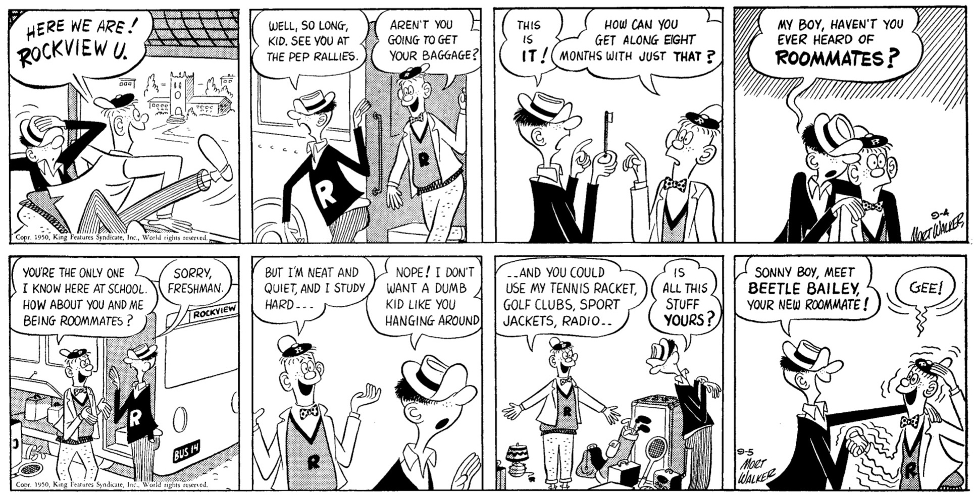 Mort Walker entered the syndication world at mid-century, with a fan’s glee and a young man’s energy. He drew funny in the mid-century magazine cartoon style: bulbous noses, bread-loaf feet, coat-hanger elbows and knees — each posture of each character full of life and personality. He understood the oft-brutal process comic strip art suffered in its path from Bristol board to newsprint. Our daily papers were dashed off on high-speed presses, where dislocated colors or under-inked blacks weren’t heeded by the men who worked the machinery. Bold, direct shapes that read well and printed without undue damage helped make Beetle one of the high-visibility strips in newspapers.