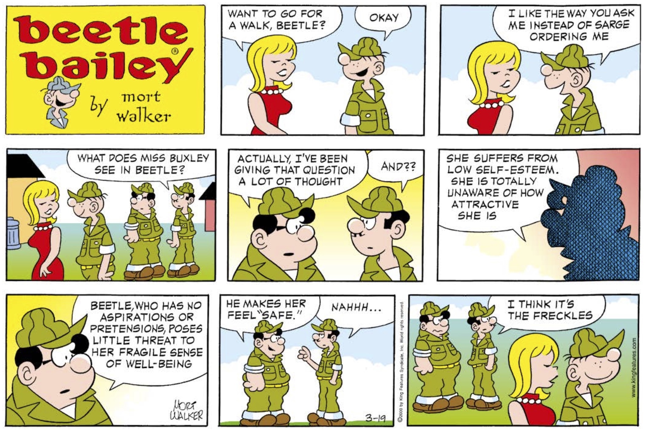 This summed up where Mort Walker’s work was in the 1990s. Predictable at every turn, its inspiration succumbed to formula, Beetle Bailey was an institution. Alongside Charles Schulz’s Peanuts, which also debuted in 1950, Walker’s strips dominated the syndication market thereafter.