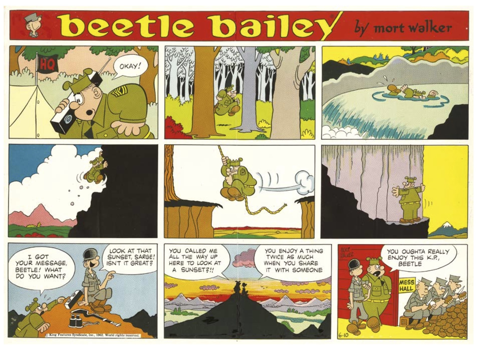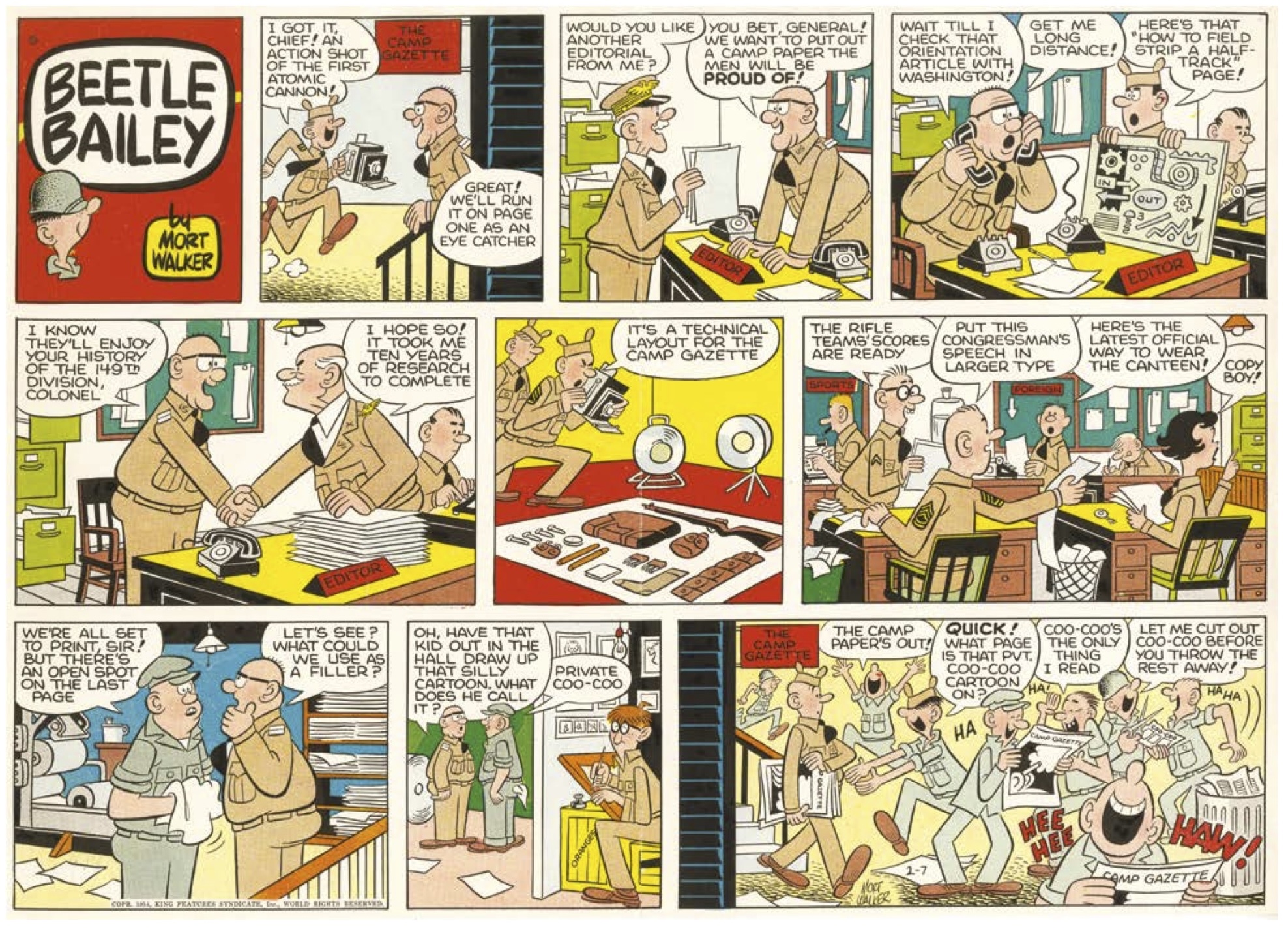 The first decade of Beetle, done before the worst post-war cuts sunk in, are a revelation. Walker’s skill for comedic escalation is impressive and amusing. The Sunday strip for Feb. 7, 1954 can serve as Exhibit A. In 199 words, spread over nine panels, it follows the progress of an issue of the Camp Swampy newspaper. Editors coordinate with writers, artists and photographers; the head editor proclaims that “we want to put out a camp paper that the men will be PROUD OF!”