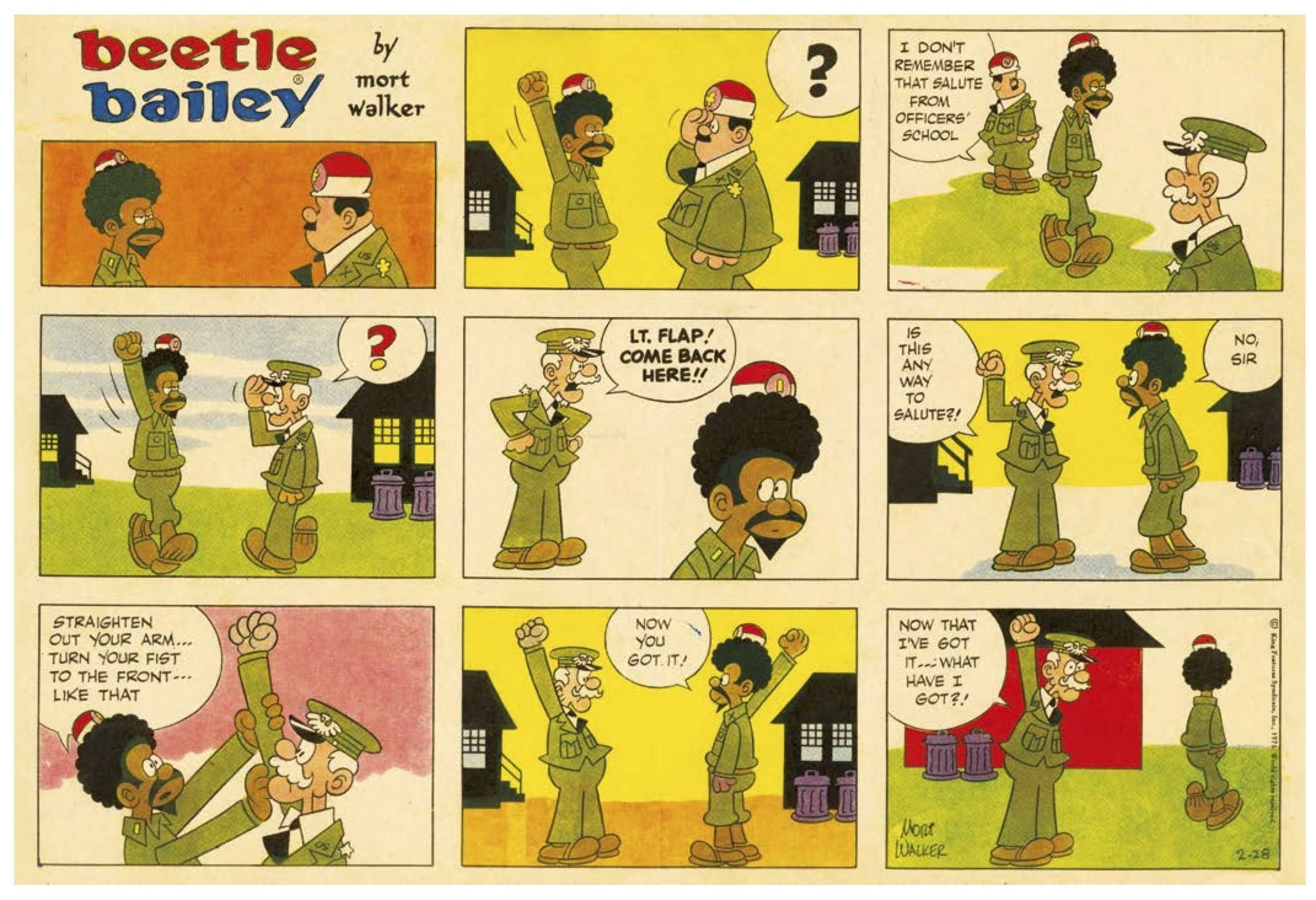 Flap’s ethnicity soon became moot. Like Rocky, Zero, Otto, the Chaplain and General Halftrack, the strip’s cast became chess pieces in a well-worn game; move one toward another and something will happen. The endgame was no longer the long play of the 1950s and ‘60s material, but a simple situation with a broad payoff: a quick laugh and nothing more.