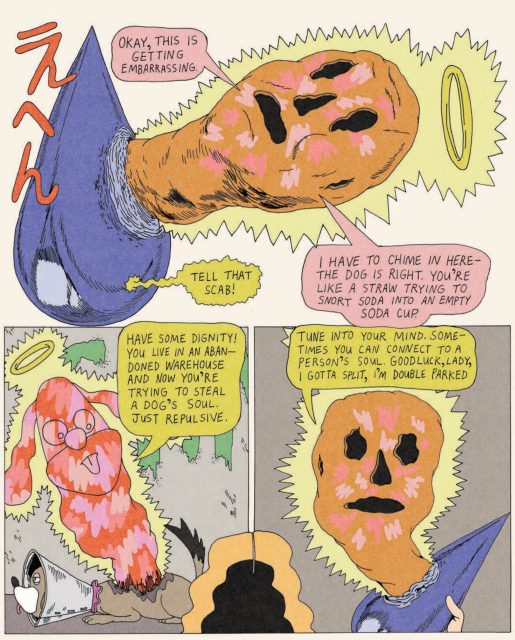 The perspective, close-ups and muted colours of the soul’s communion with Ghost Meat show Gradin’s humour and artistic talent. Ghost Meat is so determined to have her own soul that she tries to get a dog to trade his soul for a fish skeleton. “Have some dignity,” Jiro (the dog soul) admonishes. “You live in an abandoned warehouse and now you’re trying to steal a dog’s soul. Just repulsive.” The soul’s empty eyes and triangle nose remind me of vintage halloween decorations.